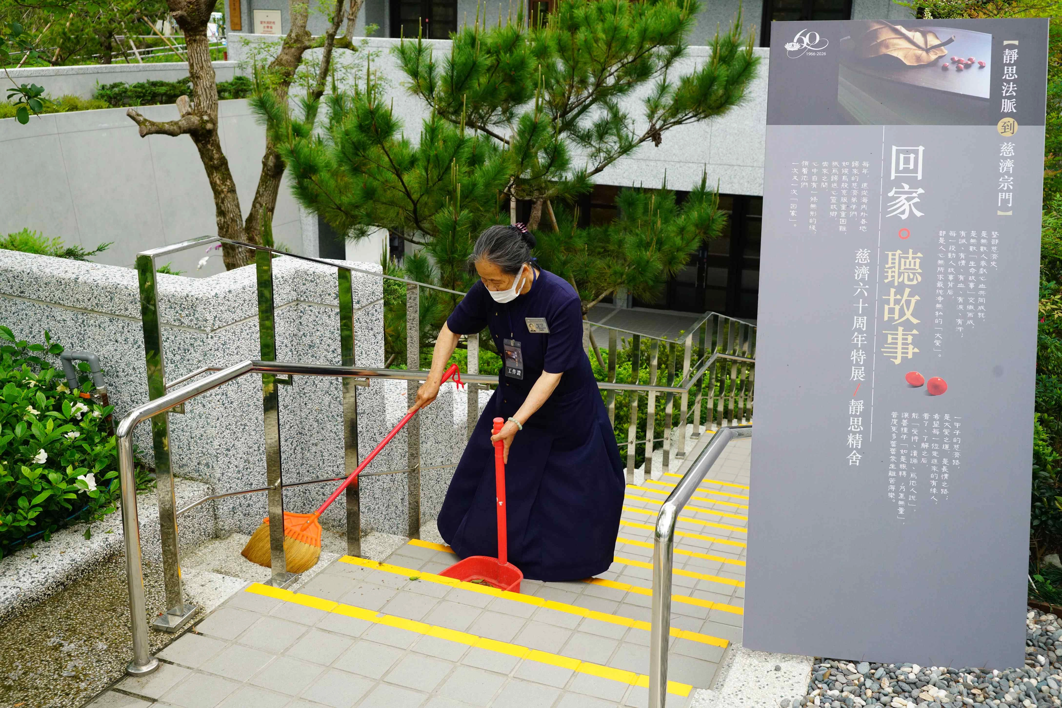 導覽組的江月霞師姊與蔡月女師姊,不僅是資深志工,更是大家心中的人品典範。導覽工作一結束,她們便放下麥克風,拿起拖把清潔展館環境。
