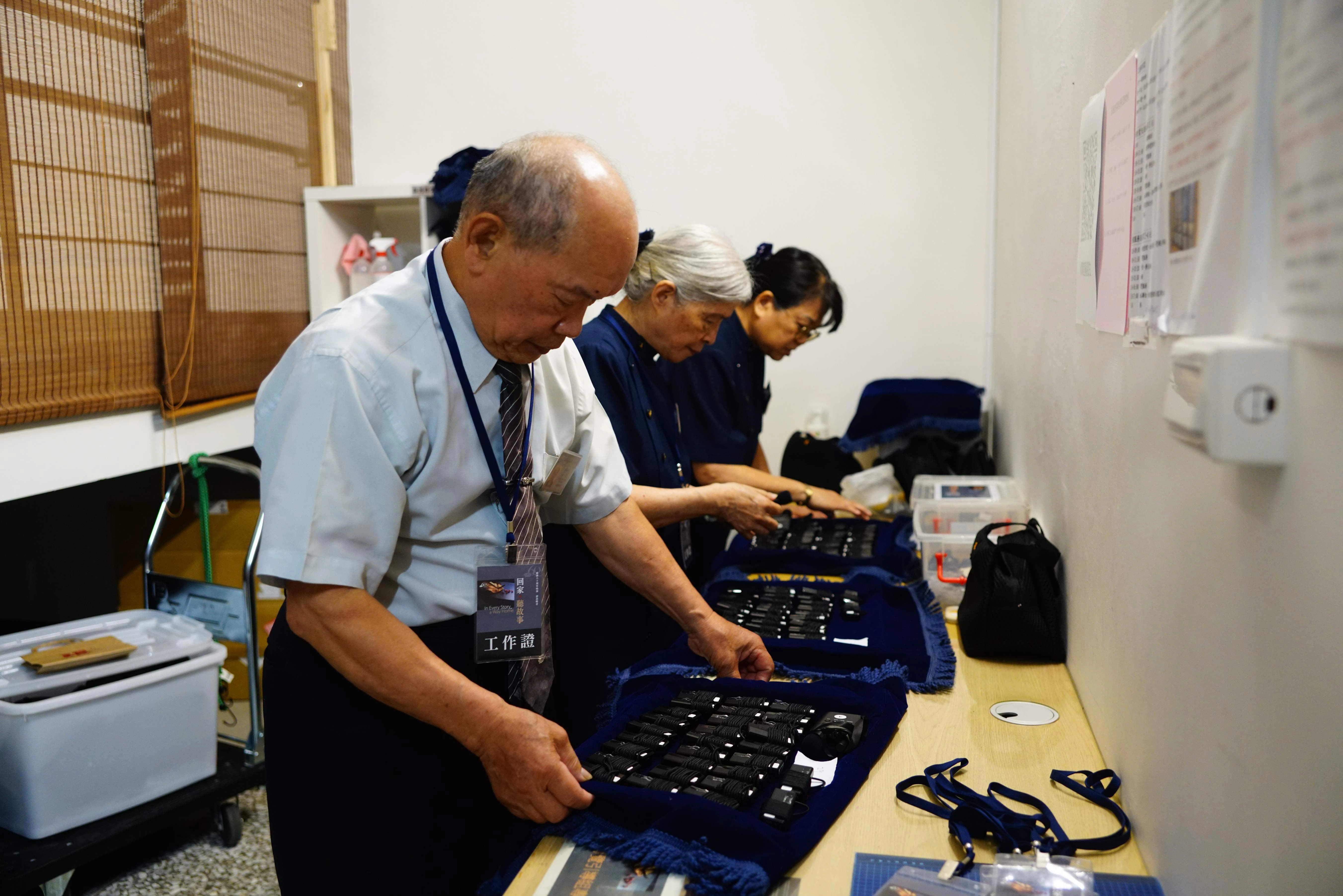 器材組鄒顯亮(左)與張順富(右),面對三百副耳麥逐一測試調頻,展現了對細節的極致專注。(攝影/許銘華)