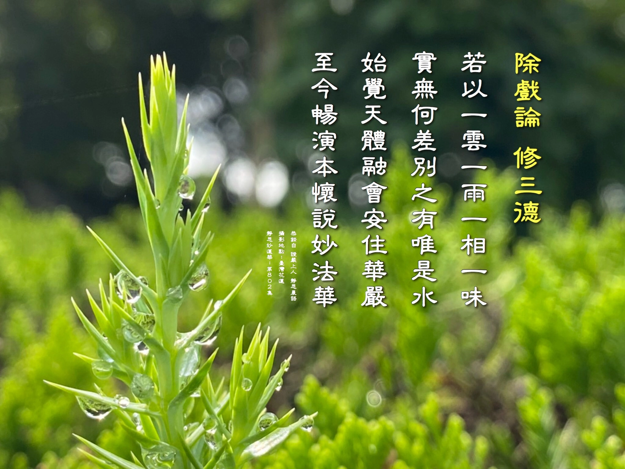 「若以一雲一雨一相一味,實無何差別之有唯是水,始覺天體融會安住華嚴,至今暢演本懷說妙法華。」