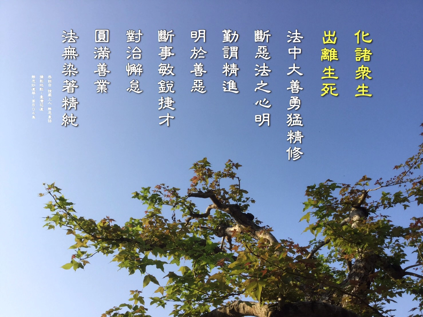 法中大善,要勇猛精進,斷惡修善,積福消障。若懈怠不入人群,守在小乘,自私、獨善其身,「心著弊欲」是無法濟眾生之苦厄,生世都將在三苦中。我們修行過,與佛有緣,為三寶事業奉獻心力,這就是人生的法資糧。所以雖然人生短暫,但我們可以用來做一些永恆的事。