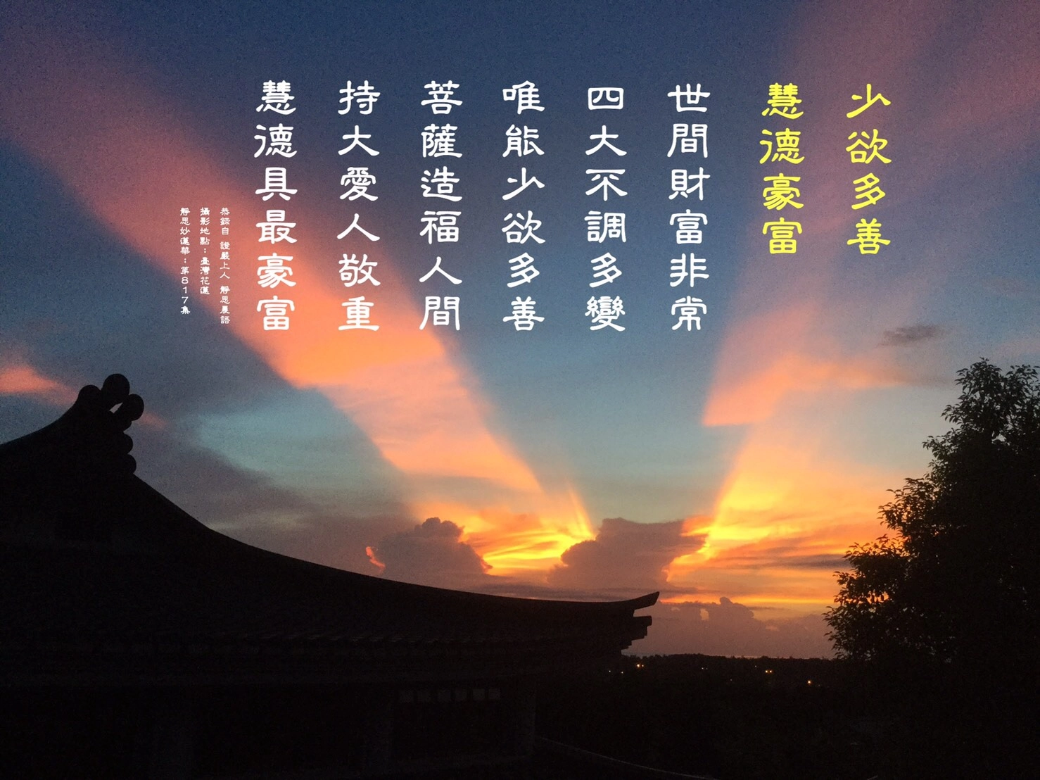 少欲多善,持大愛則人人敬重,慧德聚最富豪,心靈富有勝於家財萬貫,要用心體會世間一切無常,父母在,不遠遊,能常伴左右而至終老,也是人生一大事。