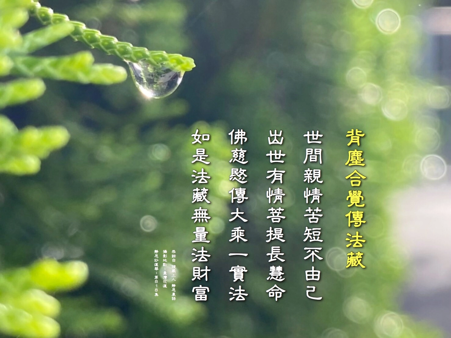 昨天適逢一年一度的父親節,世間情都是苦短,我們來到人生,凡事都由不得自己。一手撫養的孩子,長大後各有思想,不見得會照著父母的希望走,心離父母愈來愈遠,親情越來越薄。時代變遷,很多的倫理已經淡薄,做為父母要懂得看開世間的無常,要跳脱無明煩惱,走入出世的覺有情,不受五濁惡世熏染,能超脱人間俗情。