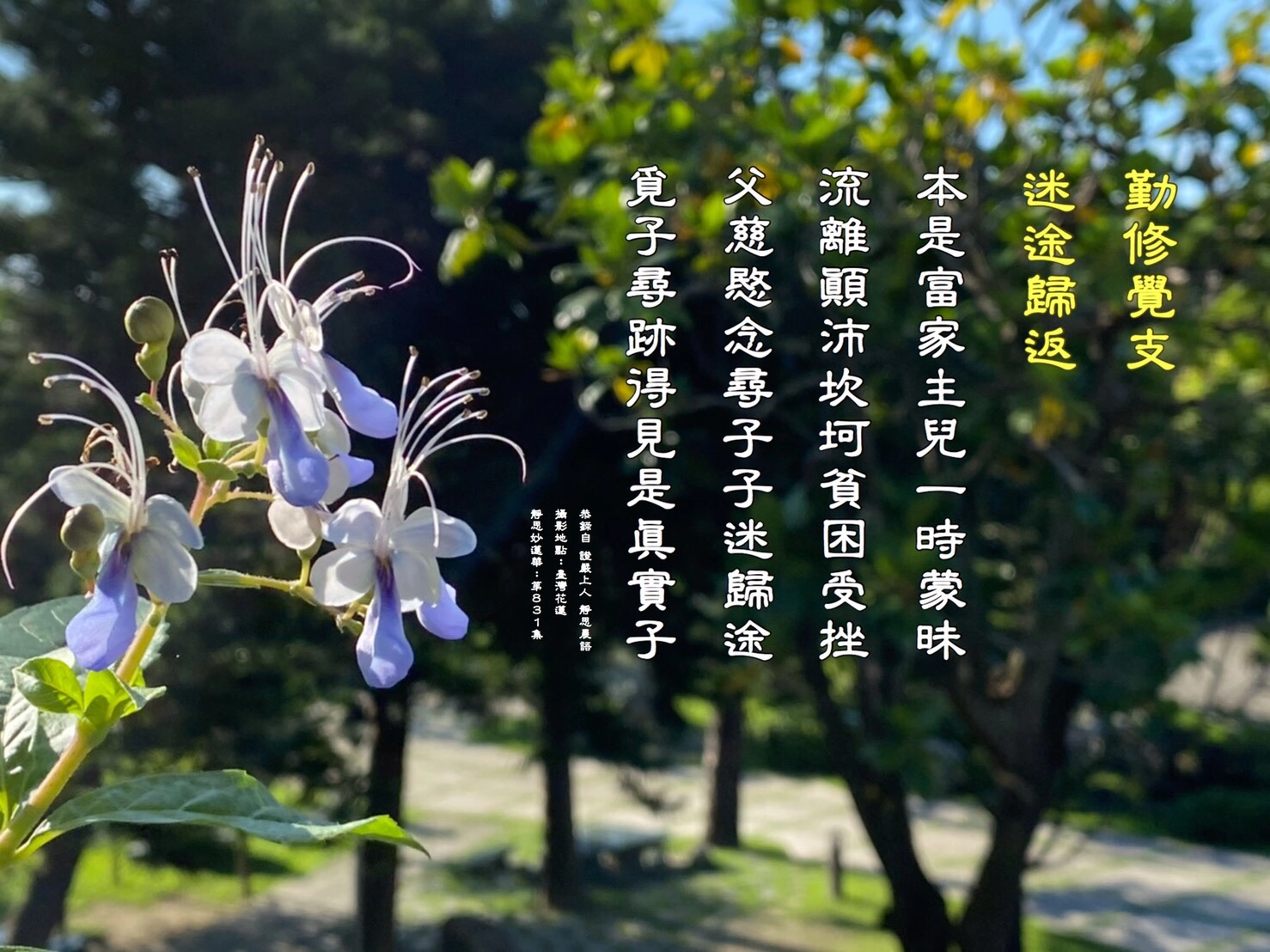我們聽法有一段時間了,對於法是否能用心體會?或還是原地踏步?我們原本也是生在富有的家庭,是富家子,但在外流離顛沛很久,流落五道,忘了慈父的思念與悲愁,我們有著辛苦的形態,使得慈父須尋子,讓窮子返回本家。