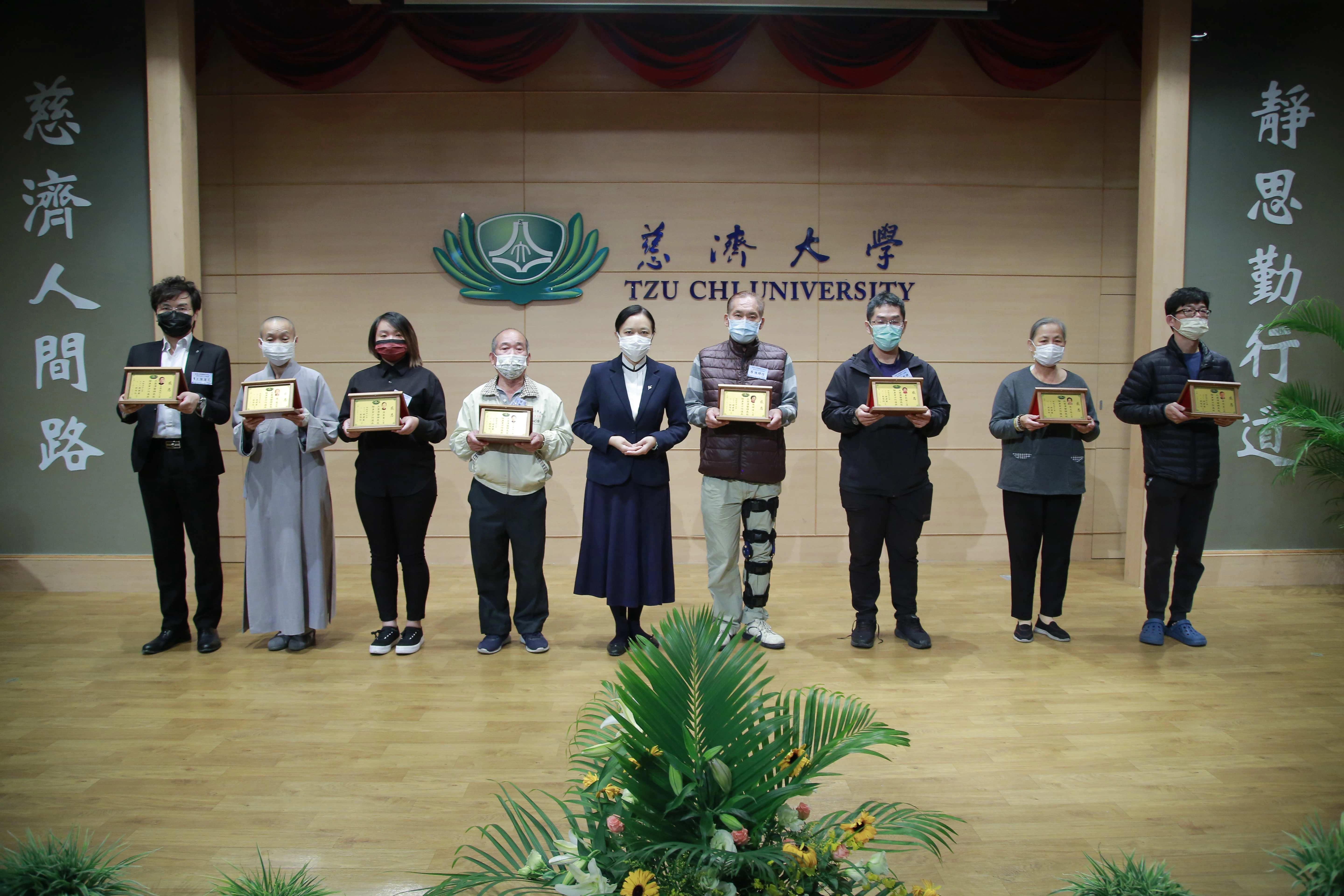 深深一鞠躬,劉怡均校長與學校一級主管們大家雙手合十,感恩所有無語良師們奉獻於醫學教育。劉怡均校長表示,二十七年前慈濟大學創校時,解剖學課大體老師的來源非常缺乏,上人呼籲大家「化無用為大用」,現在有40766人簽署志願捐贈同意書,已有1068位成為無語良師。德慈師父跟隨上人從無到有,為人慈悲、待人慈愛,劉校長說:「慈師父是我們永遠敬愛的師父,現在成為大體老師,顯示了慈濟人生前奉獻社會,往生之後成為無語良師身體力行的精神。」