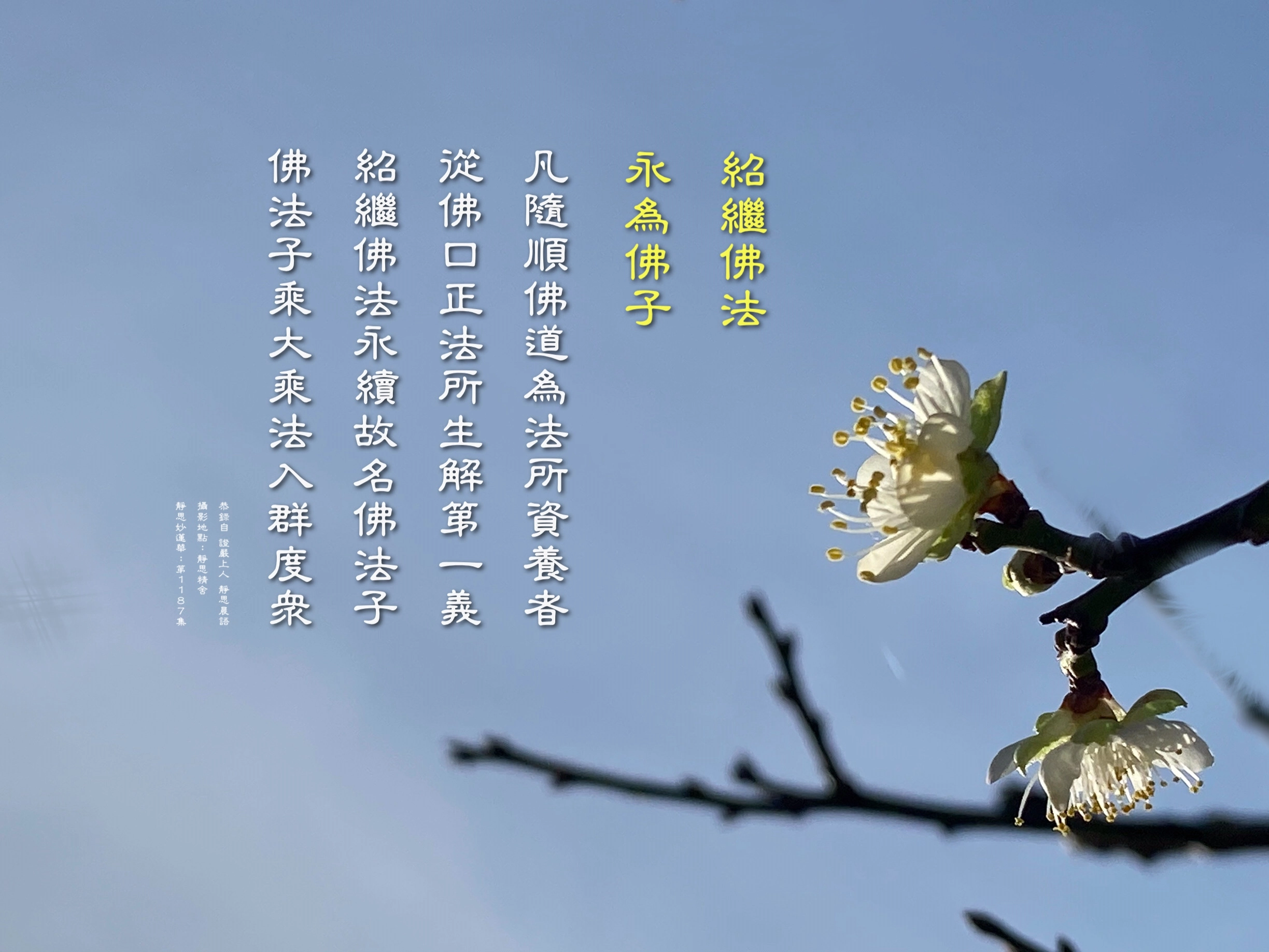 1.1「受如來法,即堪稱為法子」。叫做法子。佛陀所說的法入我們的心,心受到滋潤,像大樹延續下來的果種,種子開始萌芽,繼續耕耘,隨順佛道,成長慧命,這樣叫做法子,所以「佛法永續故名佛法子」。