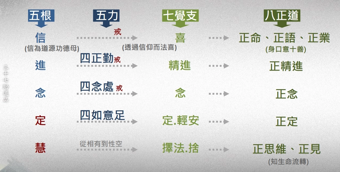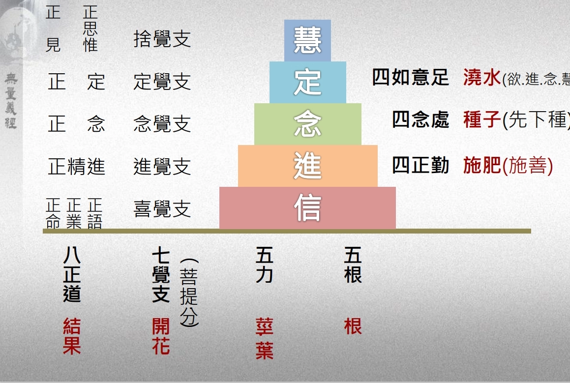 感恩淑美師姊,提供德倩師父整理的《三十七助道品》圖表,貫穿三四、二五、七八;四念處是種子,四正勤是施肥,四如意足是澆水,五根是根、五力是莖葉、七覺支是開花、八正道是結果。三十七助道品是學佛的基礎,大家進來慈濟是因「擇法覺支」:「觀察諸法用智慧,選擇教法來修行」,是我們用智慧選擇了上人的教法,在菩薩道上修行。