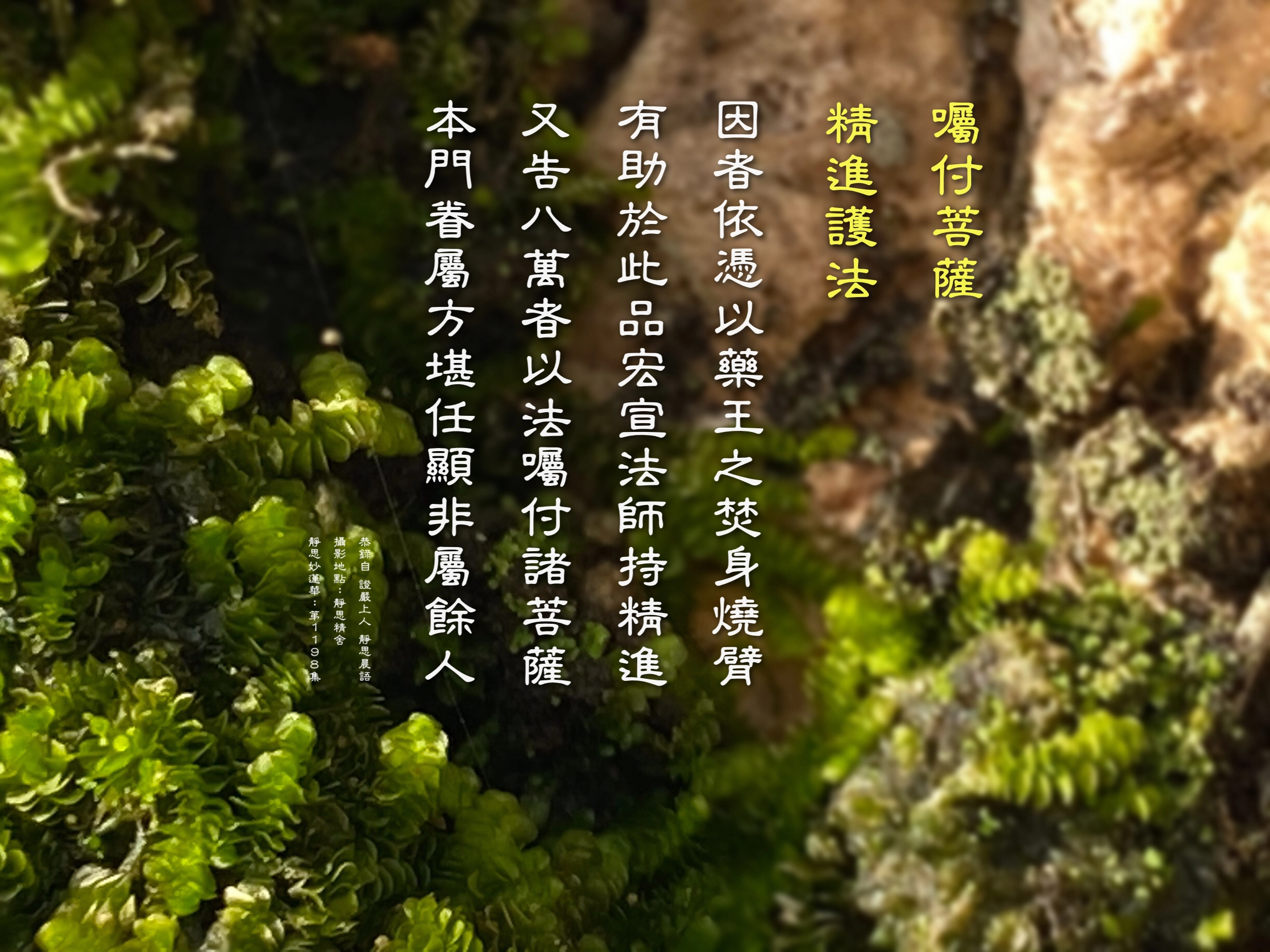 「囑付菩薩 精進護法」,最重要的,就是弘揚法師求法、持法、精進的精神。世尊以藥王菩薩為典範,談到「求法燃臂」,讓我想起小時候,看到達摩祖師的弟子──二祖慧可法師,同為斷臂求法,在冰天雪地中不顧己身,求法心切。