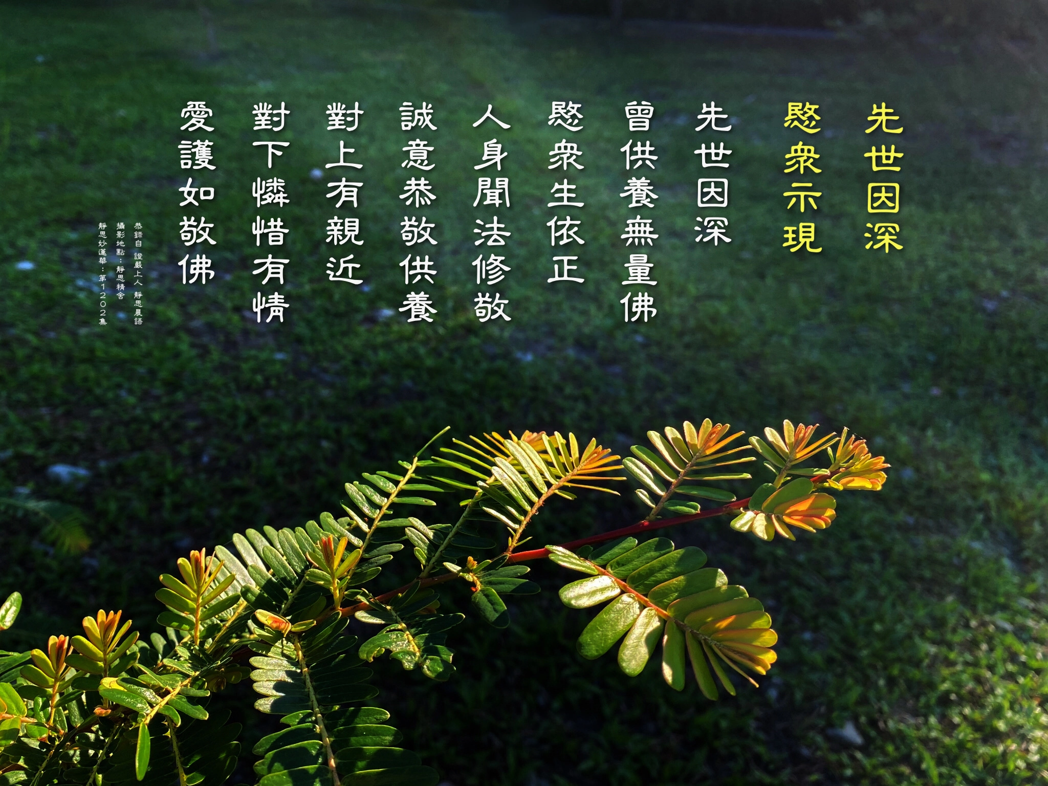 先世因深 曾供養無量佛,愍眾生依正 人身聞法修正;誠意恭敬供養 對上有親近,對下憐惜有情 愛護如敬佛。