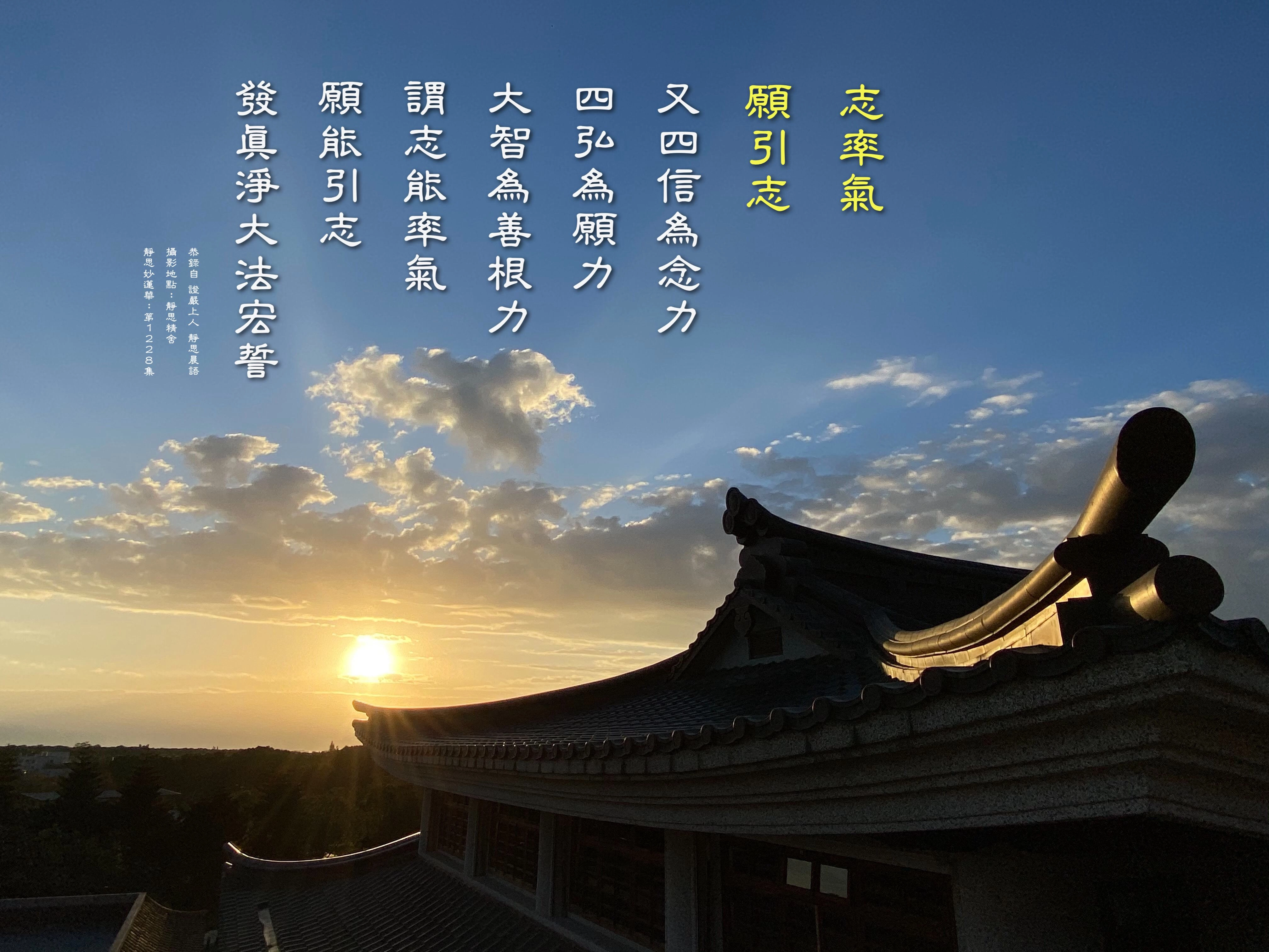 「謂志能率氣」,我們的志,能率領志氣向前進;修行若沒有志氣,信、願、行很快就會消失。因此,我們要有志氣能向前直衝,這就是氣,就是率氣;一口氣走到位,中途無論有什麼樣的無明風浪,我們都能不受影響。這個志,要立志;修行若沒有立志,這個志氣就無法向前直衝精進。