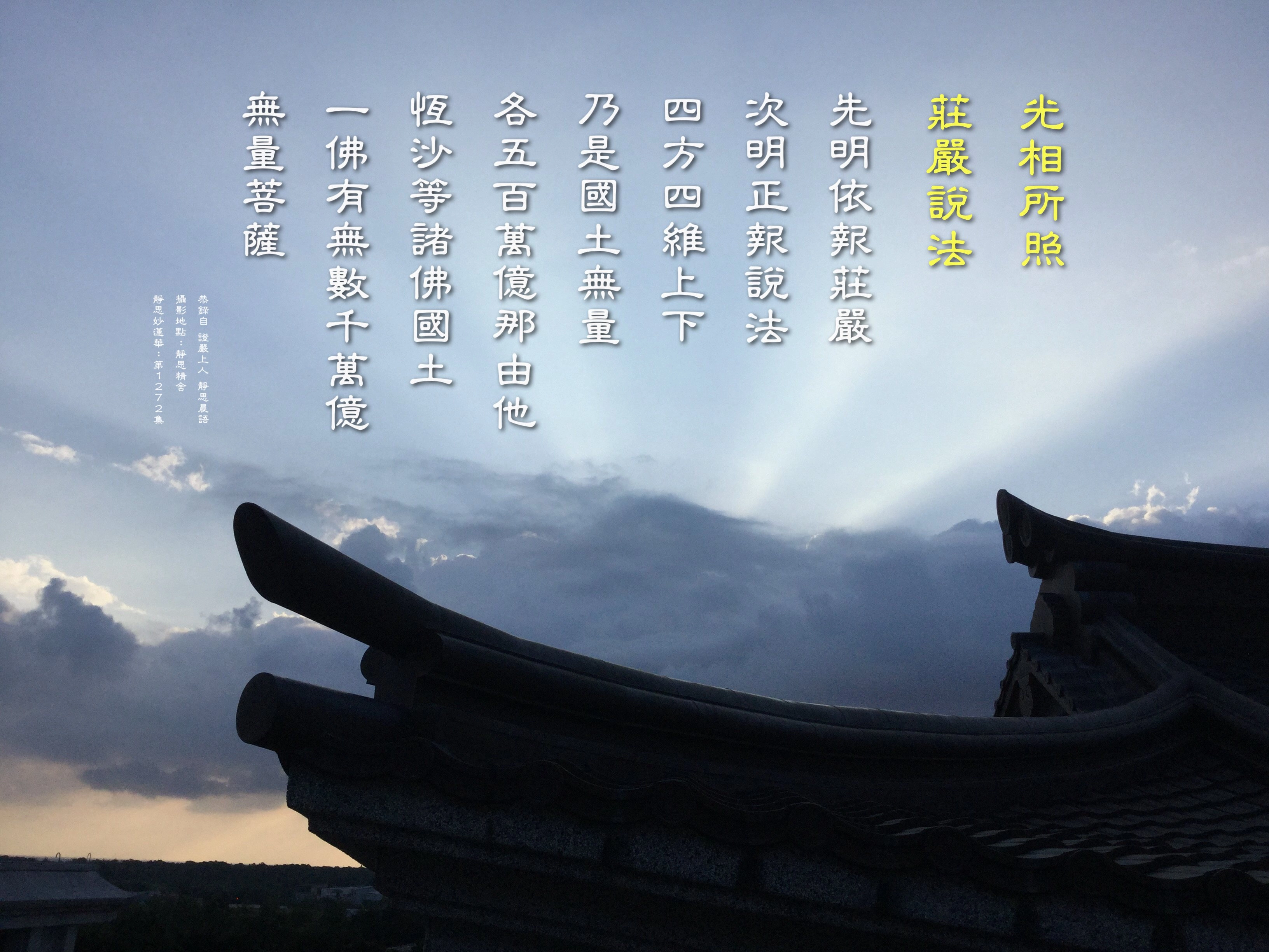 過去去東區聯絡處薰法時,清晨騎著腳踏車出門,看見晨曦清淨無染的光,如同經文「光相所照,大眾承光,見之無滯」。這晨曦的光,沒有任何障礙,聽法無障礙,光也無障礙。