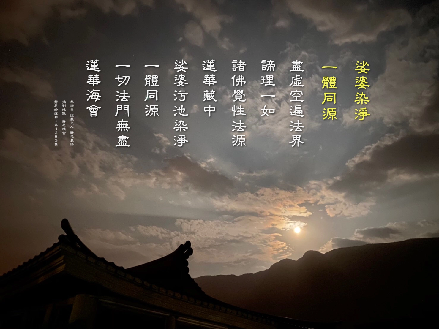 蓮花因污泥而盛開,污泥是因蓮花而美化,娑婆世界要有人間菩薩,來調和這個苦難人間。常常看到人生苦難,若看到「藍天白雲」,在那苦難中在膚慰、在付出,會覺得這樣的人間還有溫暖的氣息。佛法遍虛空法界,這個遍虛空法界的法,真理,就是要我們眾生接受之後,保持我們清淨的心,不要執持在污濁裡。