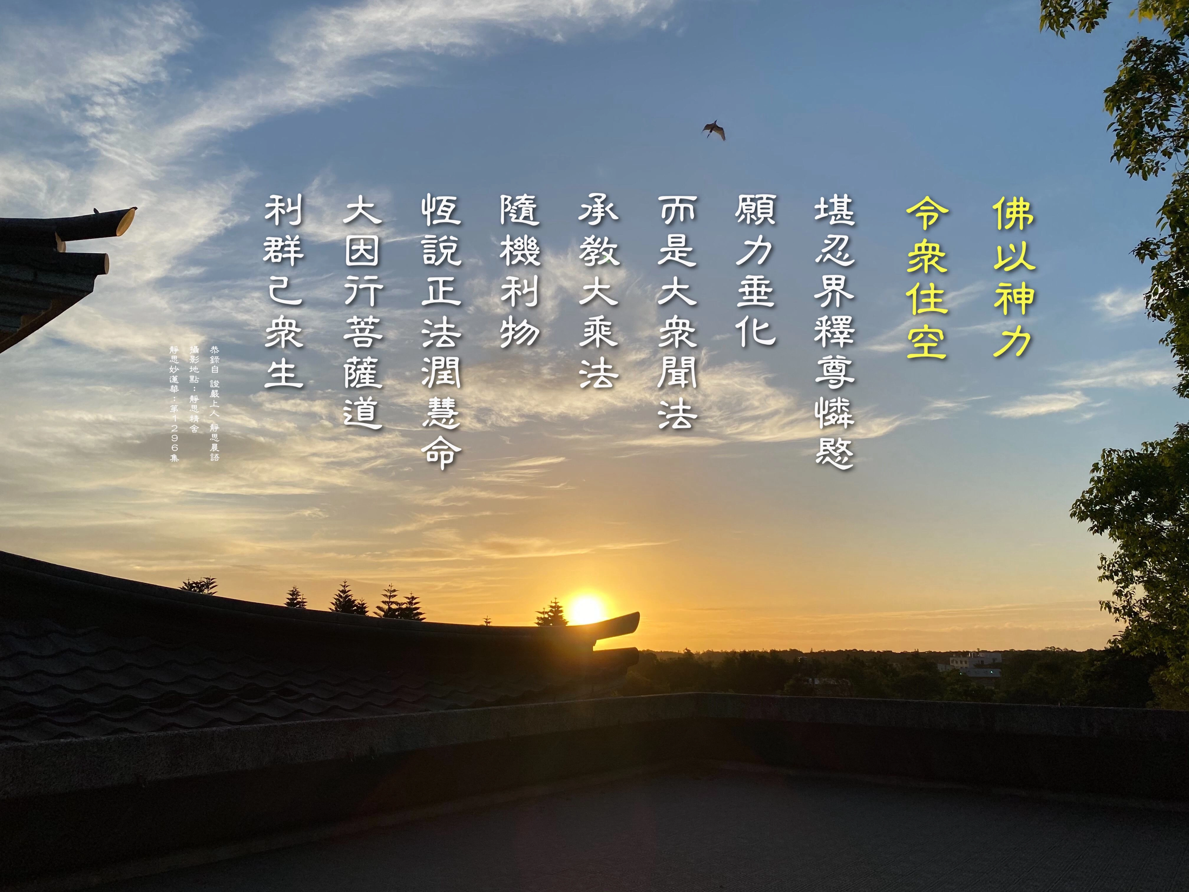 從「佛以神力 令眾住空」,讓我們想到「天助,人助,先自助」,我們自己要從 上人幫我們以「經」鋪好的路來行經,依教奉行,更重要的是,我們法親家人們要共修、同行!