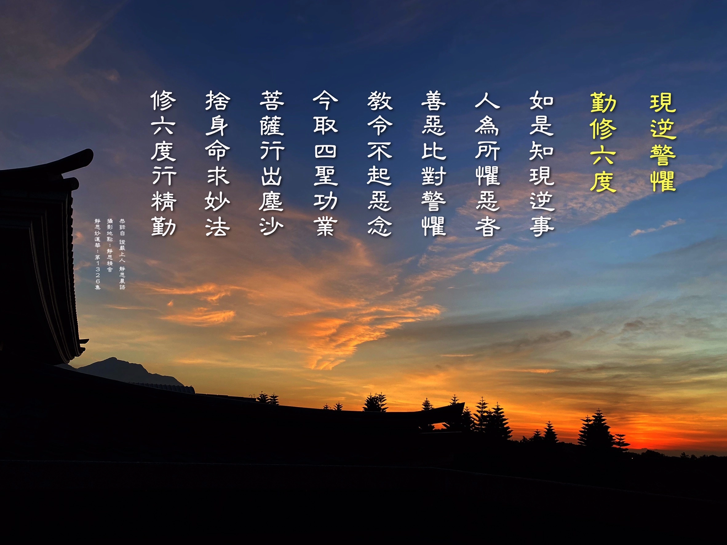 要我們去體會了解人生因緣觀,相信「因緣果報觀」。我們要如何成佛?隨順境來修法,要好好地感恩,把握;逆境現前,我們要能度過這個逆境的境界,心無動搖,這就是來成就我們的,我們也要感恩。