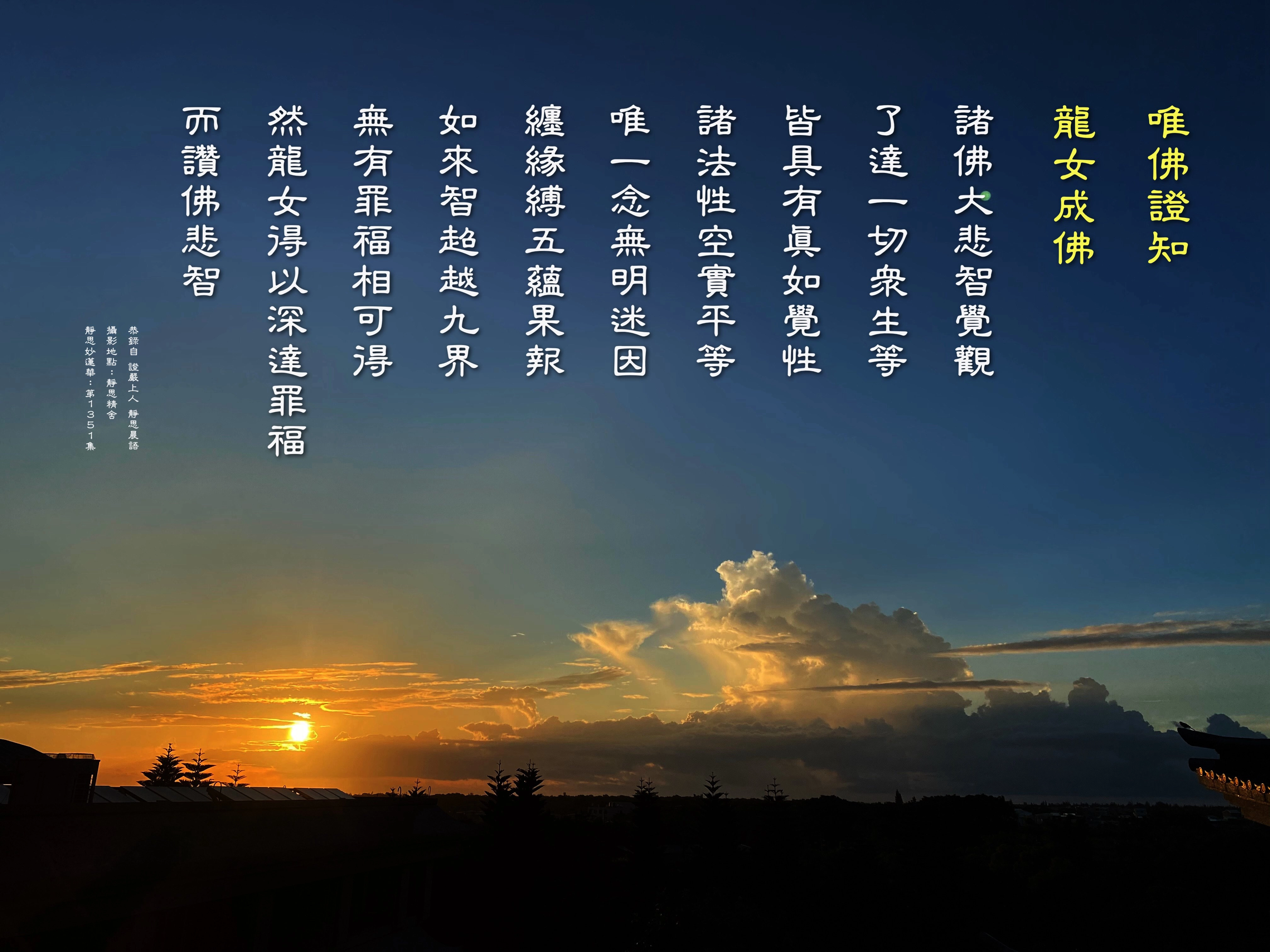 文殊菩薩還沒有回答,龍女忽然出現在這個靈山會上,而且向佛陀頂禮,先讚歎佛陀,復言自己也能成佛。讚歎佛已深達罪福相,應該佛陀能夠作證她能夠成佛,成佛來度眾生。