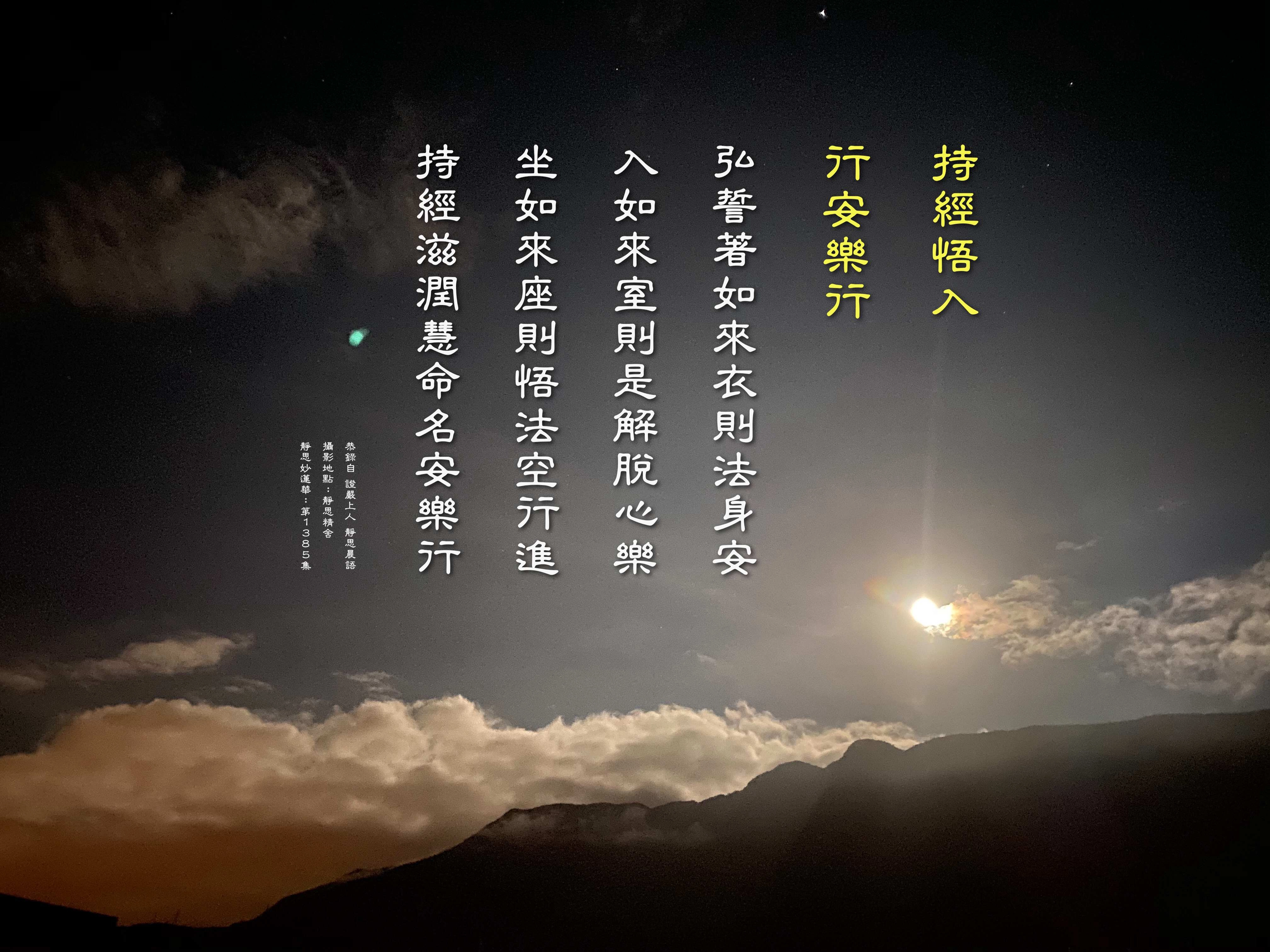 「持經滋潤慧命名安樂行」。我們持經,就像「弘誓著如來衣」一樣,自己要先覺悟,先體會,穿著這件衣服,能使我們的慧命不斷地增長。「住忍辱地故身安樂」。我們若能住在忍的地方,我們的心,我們的身就能安樂。「得身心輕安名安樂行」。我們遇事心不煩,這叫做心輕身安,叫做安樂行。
