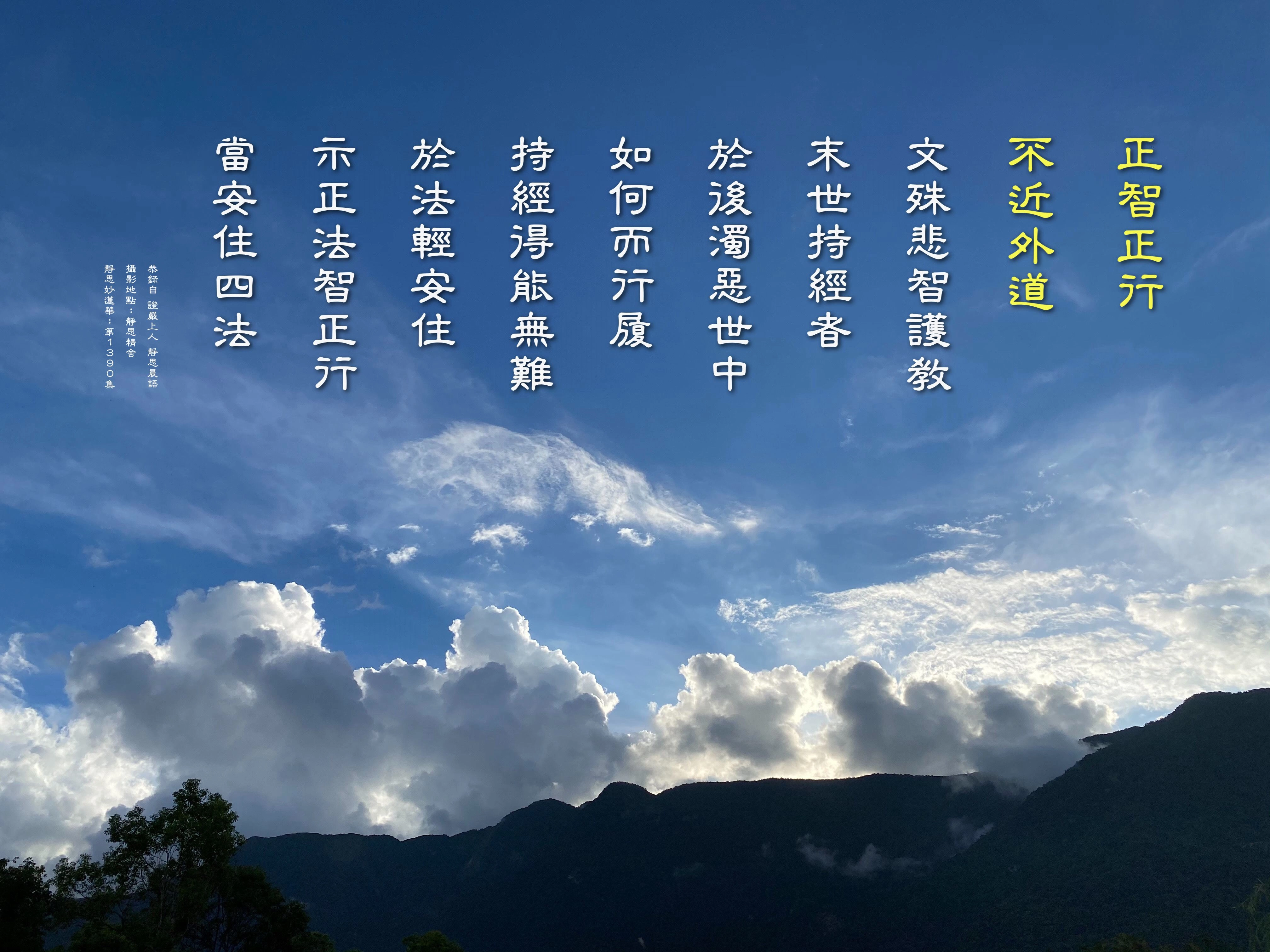 「正智」,就是在人群中沒有受到種種煩惱,惹來污染自己的心志。外面人我是非,一切一切的分別能夠清楚,它能夠很乾淨,很純真,沒有雜染的煩惱無明,沒有錯誤非分之想。
