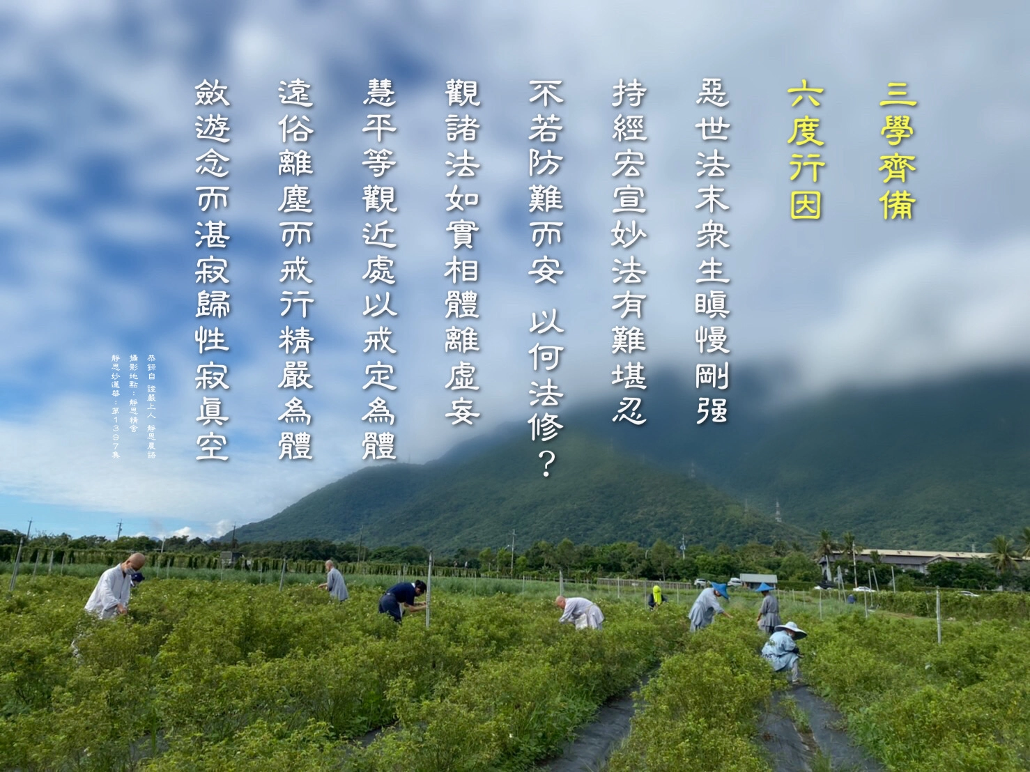 「三學齊備,六度行因」。「三學」:戒、定、慧。「六度」:布施、持戒、忍辱、精進、禪定、智慧。我們修行入人群中去,要有「三學」、「六度行」。