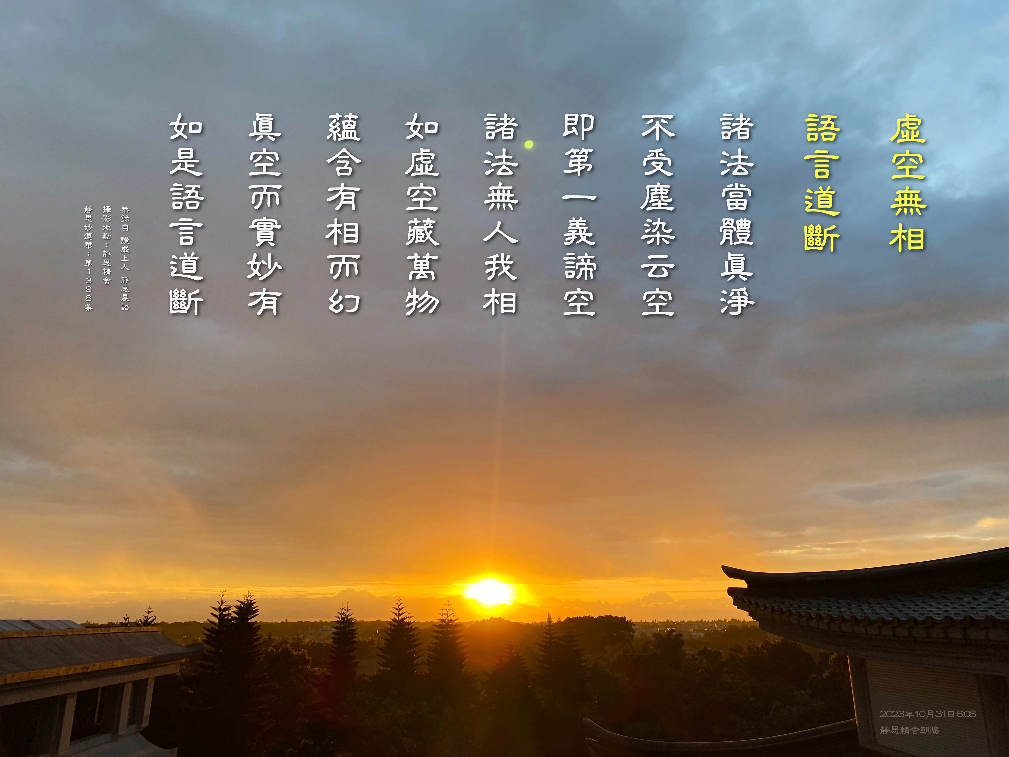 今天這一集的主題:「虛空無相 語言道斷」,上人談到「諸法無人我相」,人的身體不斷在變化中,幾年不見的孩子,再見到時已經長高很多了,人都是這樣,每日、每時刻,無不都是虛幻變化中。