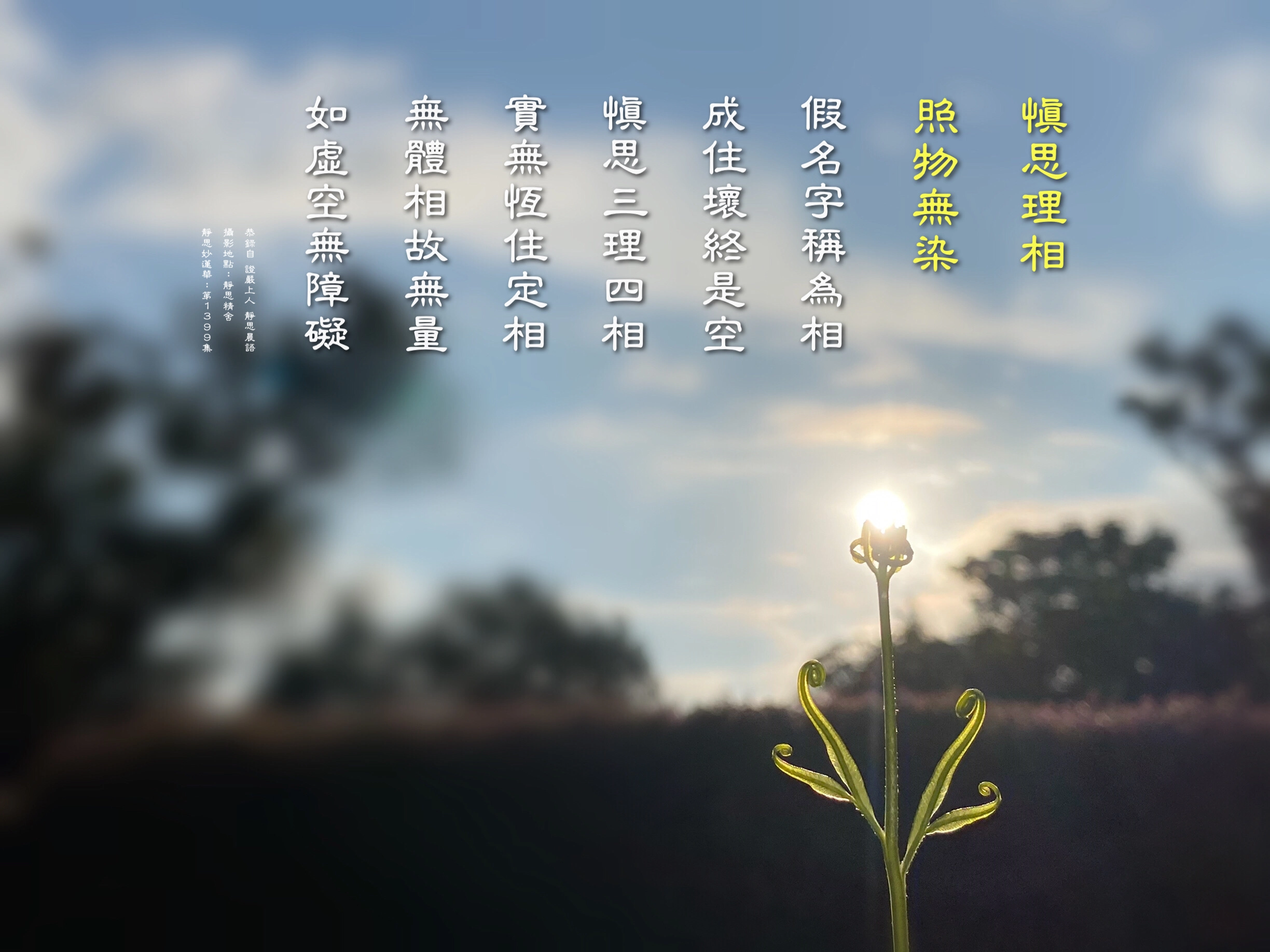 今天上人開示無相:為無我、人、眾生、壽者,虛妄之相。謂真理之絕眾相,非無如實圓鏡本清淨照物,物移鏡空。