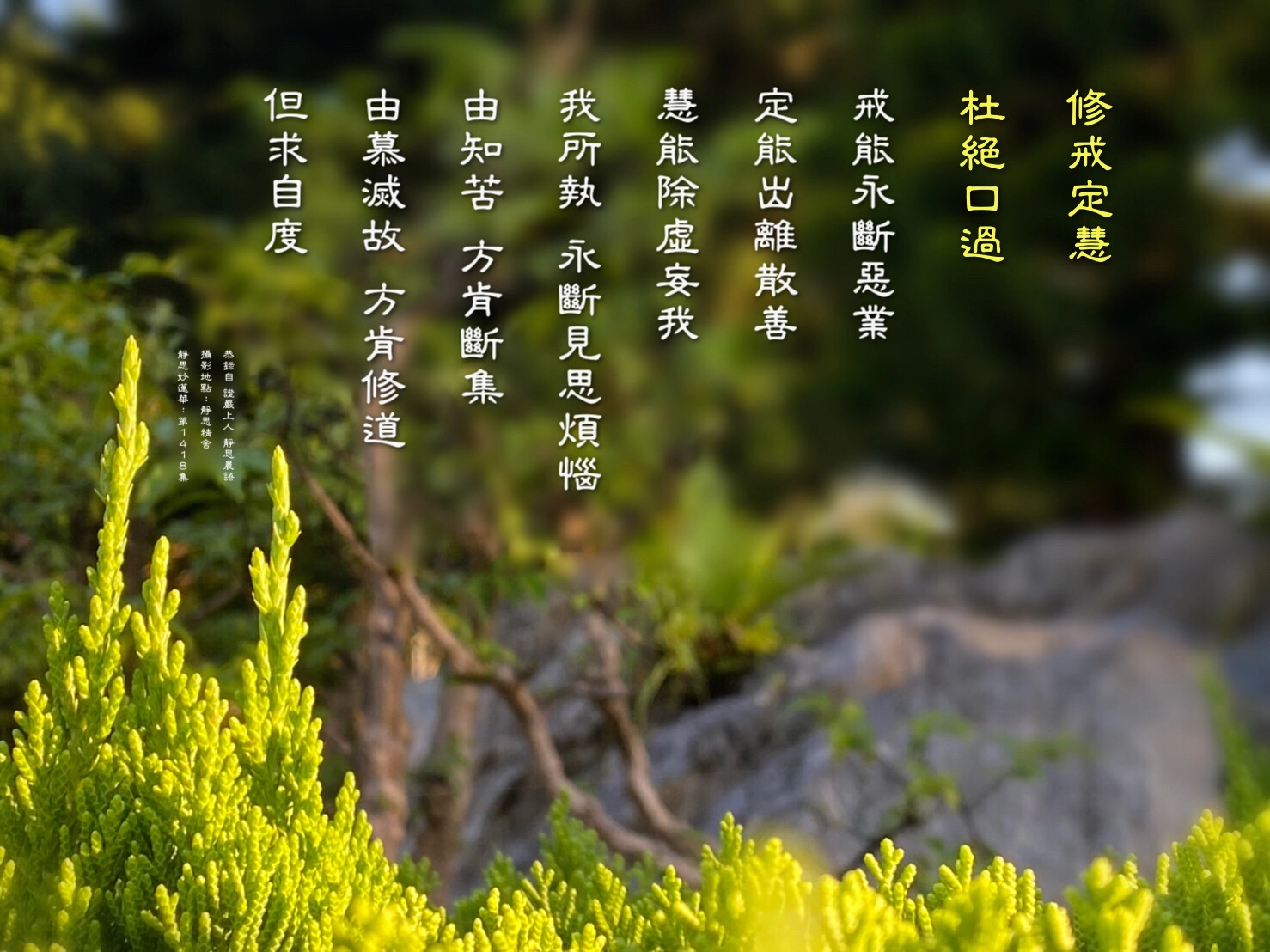 要斷掉了我們口頭很愛批評人這種的源頭,源頭就是心。我們要斷絕講人的是非,這種的習氣我們要去除,這樣就「不生心」,就不會有這個心態,一直動不動要批評人,要怨嫌人。我們應該要記得,「戒定慧」。「戒能永斷惡業,定能出離散善,慧能除虛妄我」。「戒定慧」,斷去了我們那個執著的見解。