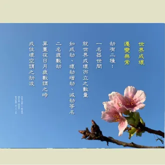 2024/05/05早課連線《法華經》第1516集 世界成壞 遷變無常思惟提綱(敬請貼緊上人開示的內容找答案)/德倩師父;圖卡/釋德宛 1.何謂「劫」?何謂「器世間」?1.1「劫」就是長時間。1.2「器世間」就是有器物的世間,所接觸得到的、看得到的東西,都涵蓋在內。在這個大空間,所有...