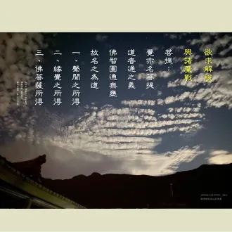 2024/01/05早課連線《法華經》第1451集 眾生樂見 如慕賢聖思惟提綱(敬請貼緊上人開示的內容找答案)/德倩師父;圖卡/釋德宛 1.小乘行者,雖然了解苦的源頭,斷惑了,卻還未真正體解諦理。為什麼?那個階段就是要有發菩薩心,才能夠體解佛陀內心本懷這個妙法──人人可成佛,...