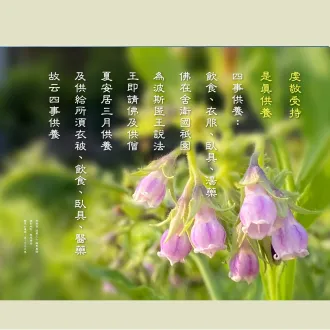2024/09/06早課連線《法華經》第1596集 虔敬受持 是真供養思惟提綱(敬請貼緊上人開示的內容找答案)/德倩師父;圖卡/釋德宛 1.何謂「四事供養」?四事供養:飲食、衣服、臥具、湯藥。 2.以往人家若來供養,佛陀自動就會為他祝福,這次波斯匿王自己展現「我很歡喜、功德很大、...