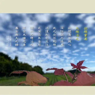 2023/10/26早課連線《法華經》第1393集 欲想害道 九想治之思惟提綱(敬請貼緊上人開示的內容找答案)/德倩師父;圖卡/釋德宛 1.為什麼佛陀說女人「非是法器」?欠缺了志願力,沒有丈夫相、沒有丈夫身,不只形態嬌弱,體態、心態都是很弱。所以佛陀說不是法器,因為她沒有那個...