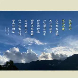 2023/10/23早課連線《法華經》第1390集 正智正行 不近外道思惟提綱(敬請貼緊上人開示的內容找答案)/德倩師父;圖卡/釋德宛 1.何謂「正智」?「正智」,就是在人群中沒有受到種種煩惱,惹來污染自己的心志。外面人我是非,一切一切的分別能夠清楚,它能夠很乾淨,很純真,沒...