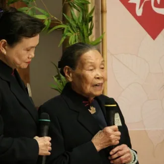 【法在日常-2008年隨師劄記】有法度文.釋德澡 有法度 台北市中山聯絡處社區歲末祝福,蔡馮鳳妹師姊(右)在曾秀蘭師姊陪同下現身說法,與會眾分享做慈濟的心得。(2008/01/05;攝影:傅代雯) 七十八歲的馮鳳妹如同一部活藏經,懂上人的心,知道上人要做的事...