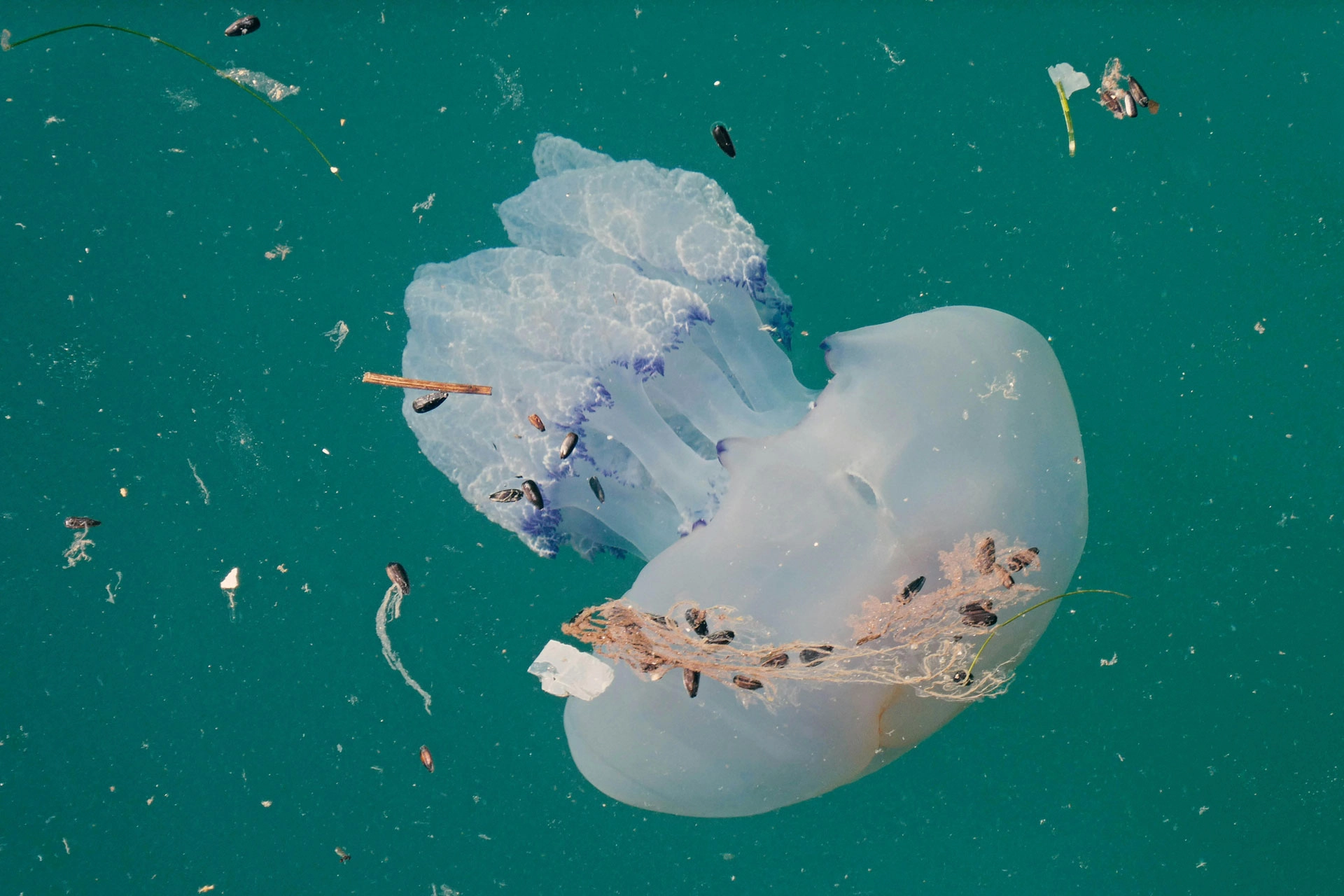 漂浮在海洋垃圾中的水母。Photo by Nadejda Bostanova on Pexels