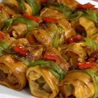 【安心好素】紅燒豆包捲生豆包(又稱豆腐皮)是素食人士最喜歡的食材,由豆漿表面凝結而成,用來滷製非常美味,而且熱量又不會過高,是補充蛋白質的首選。將新鮮蔬菜包入一同料理,依次補充蛋白質、維生素與膳食纖維,學會做這款豆包...