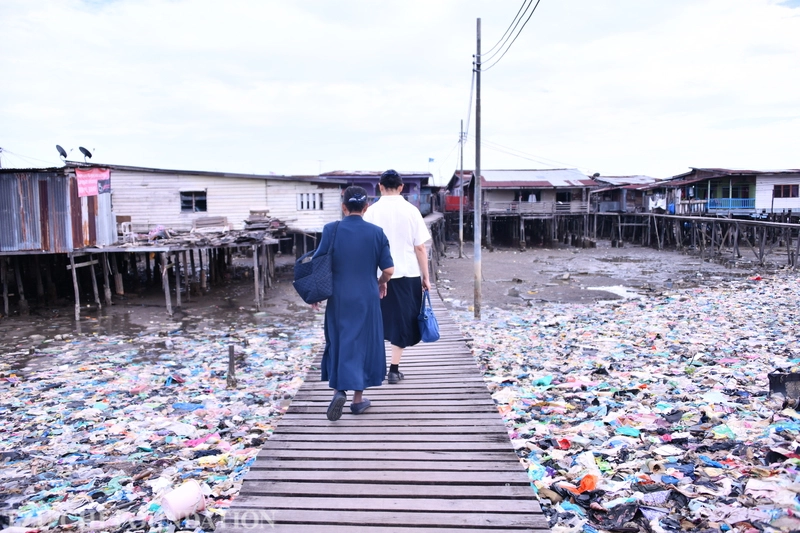 馬來西亞沙巴州斗湖甘榜狄丁岸木屋由岸邊延伸到海面,以劣質的木枝、木板搭起長長的狹窄走道,伸向海面;潮起潮落,村民吃喝拉撒都在海上。(2017/11/17攝影/林興來)