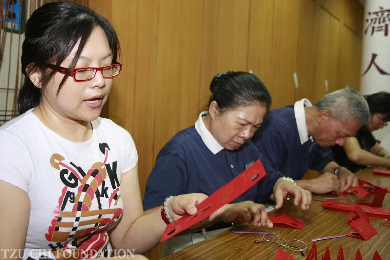 楊冠新師兄和同修周錦求師姊,及長女楊晶媖(左一),三人一起用心投入福慧紅包的製作。(2010/10/04攝影/徐金生)