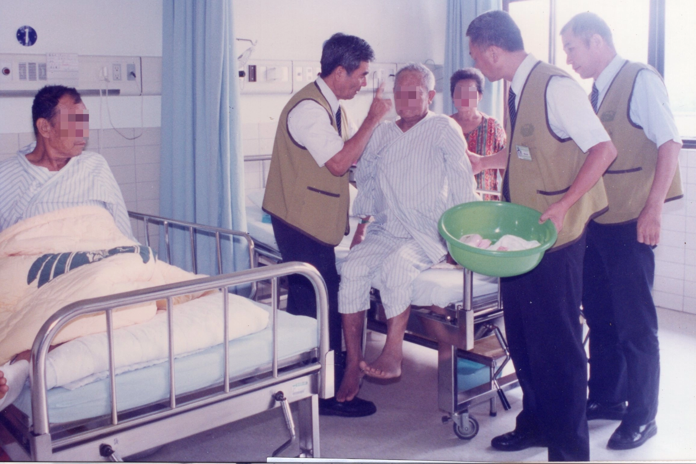 楊冠新(右前一)、曾益冰(左)與邱坤亮(右一)為住院男病患大德沐浴、洗頭(浴佛)後,領隊曾益冰師兄復為說法。(圖片來源:楊冠新)