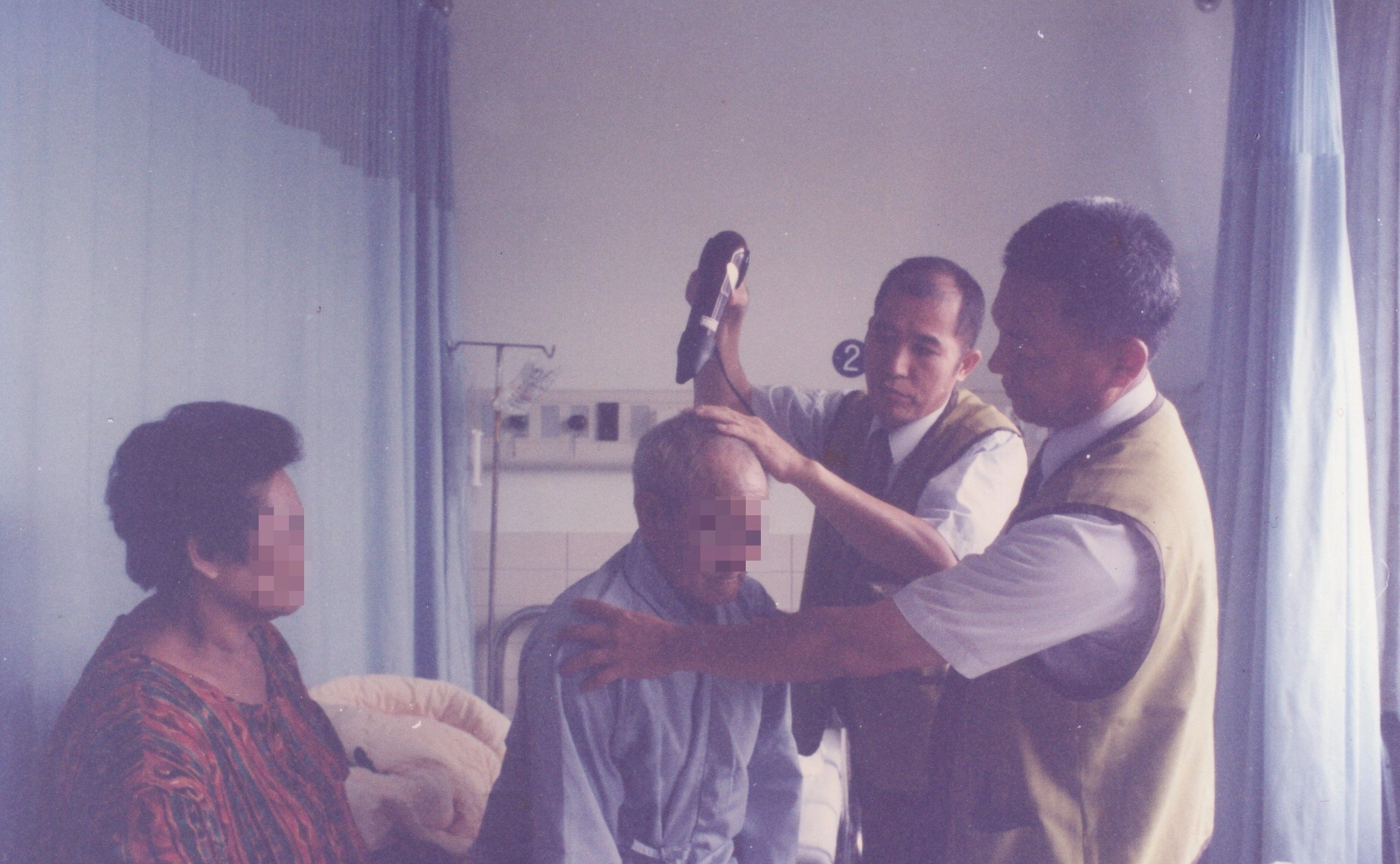 楊冠新(右一)與邱坤亮為病患洗頭後吹乾頭髮,毫不馬虎;也在付出中,體認到做志工更不能粗心大意。(圖片來源:楊冠新)