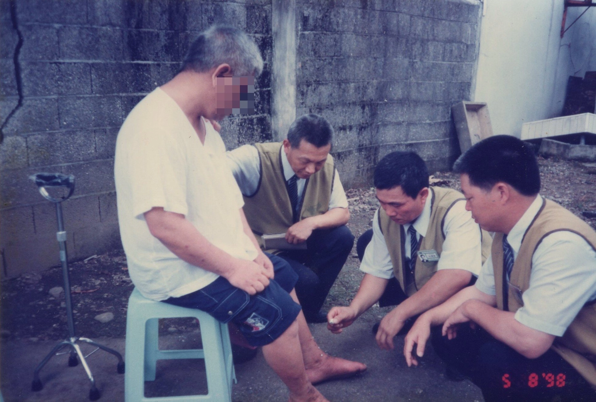 楊冠新(左二)與男眾醫療志工關懷出院病患,並為病患洗腳擦藥膏。(圖片來源:楊冠新)