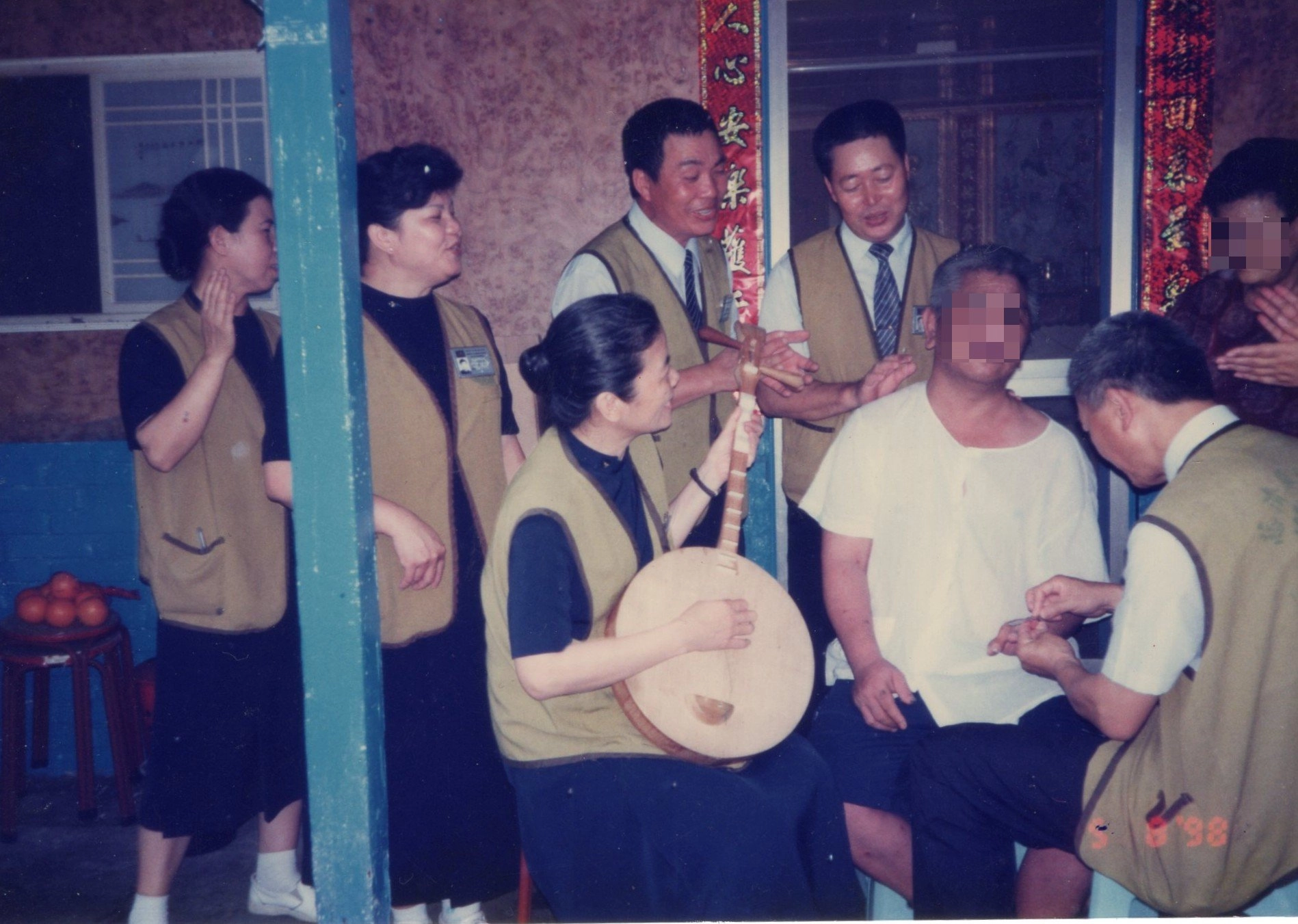 投入醫療志工後,楊冠新(右前一)與顏惠美師姊(彈唱者)帶志工前往出院病患居家關懷,一面彈唱一面修剪指甲。(圖片來源:楊冠新)