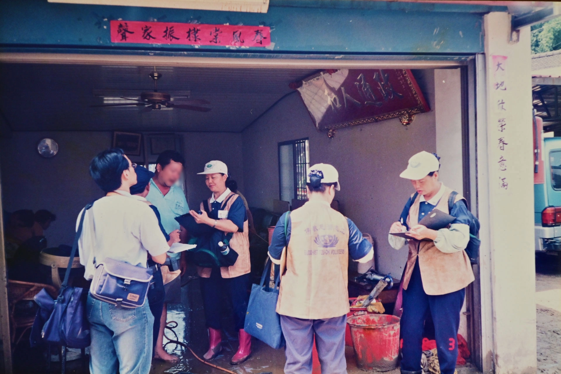 桃芝颱風過後,黃麗芬(右三)偕同慈濟志工進行訪視關懷。(2001/08/03;圖片來源:黃麗芬提供)