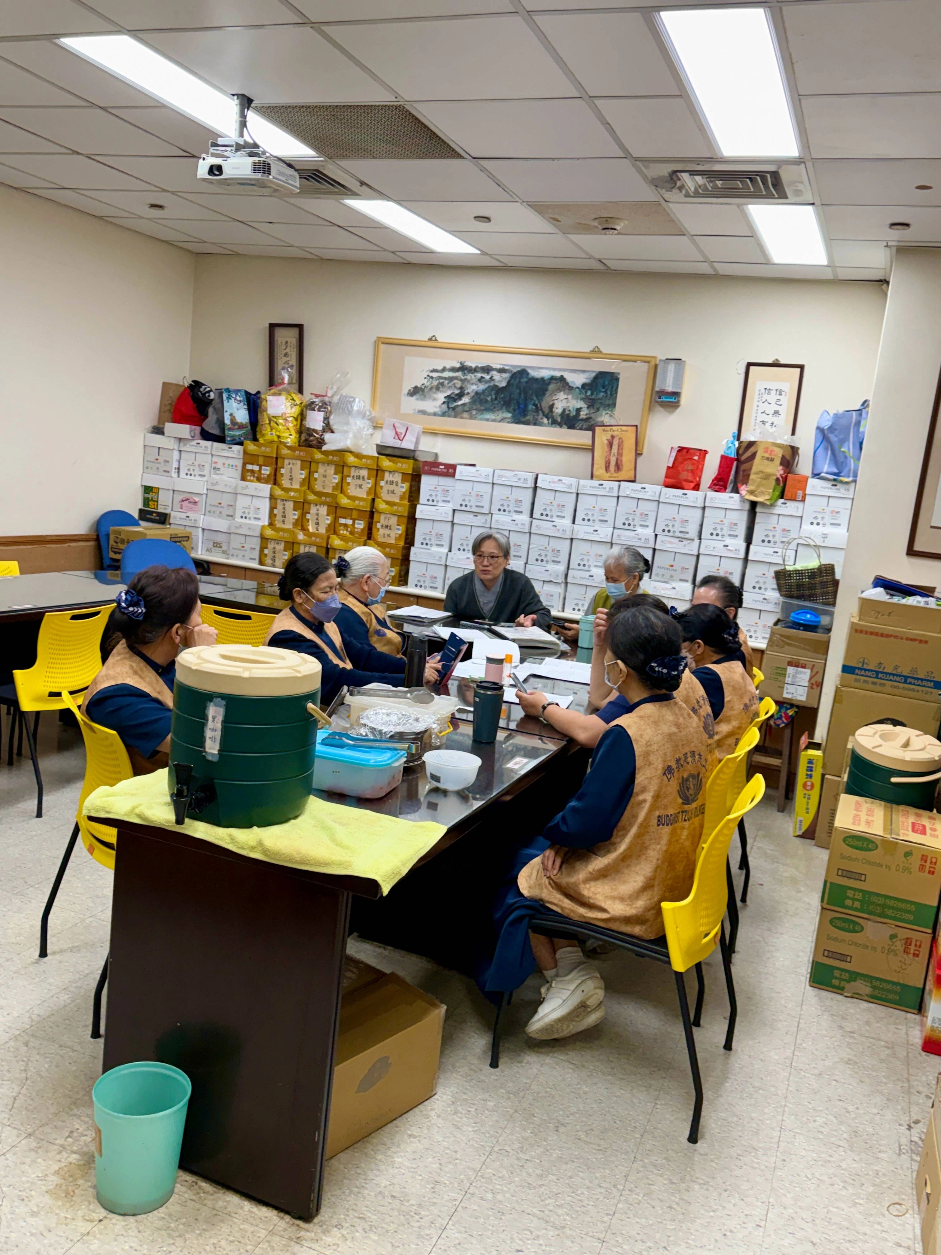 從大廳走進志工室,再往人文室,一路看過去,每個空間都是忙碌的身影。大廳裡,春足師姊和義賣團隊俐落地擺攤、招呼客人;辦公室裡,有人整理資料,有人在小廚房備餐,有人來回走動傳遞文件與物品。這樣的早晨,很有節奏與活力,而且是每天都在發生的日常。