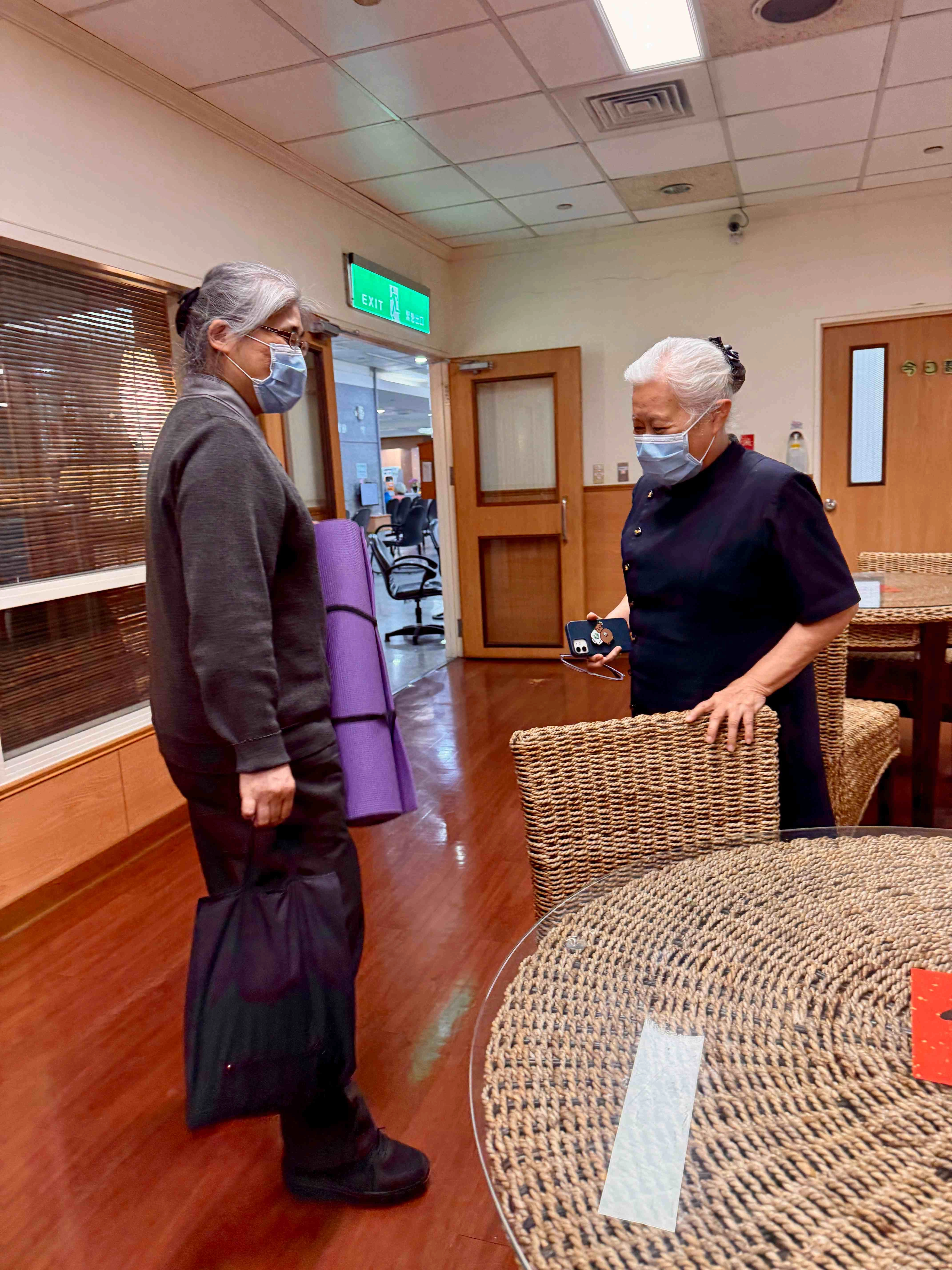採訪尾聲時,紅芬師姊趕緊來提醒鶯鶯師姊一起去上運動課,她們強迫自己要運動以維持健康與體力,才能繼續常住醫院來服務大眾。(攝影/許愷玹)