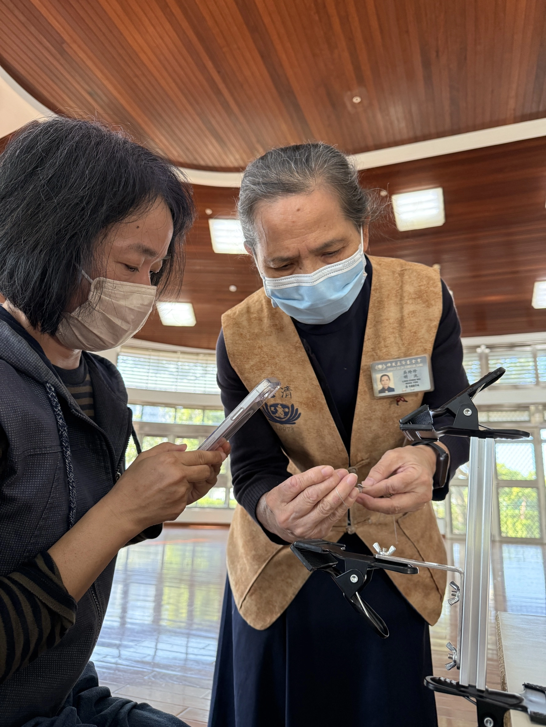 吳玲珍師姊(右)承擔雲林區核心醫療幹事二十多年,希望大林慈院成為雲嘉地區受人倚重的醫院。忙碌的她卻志願來慈院宿舍教醫師太太們製作五毛錢吊飾,細心、耐心與好手藝令大家對她非常敬重。(攝影/許愷玹)