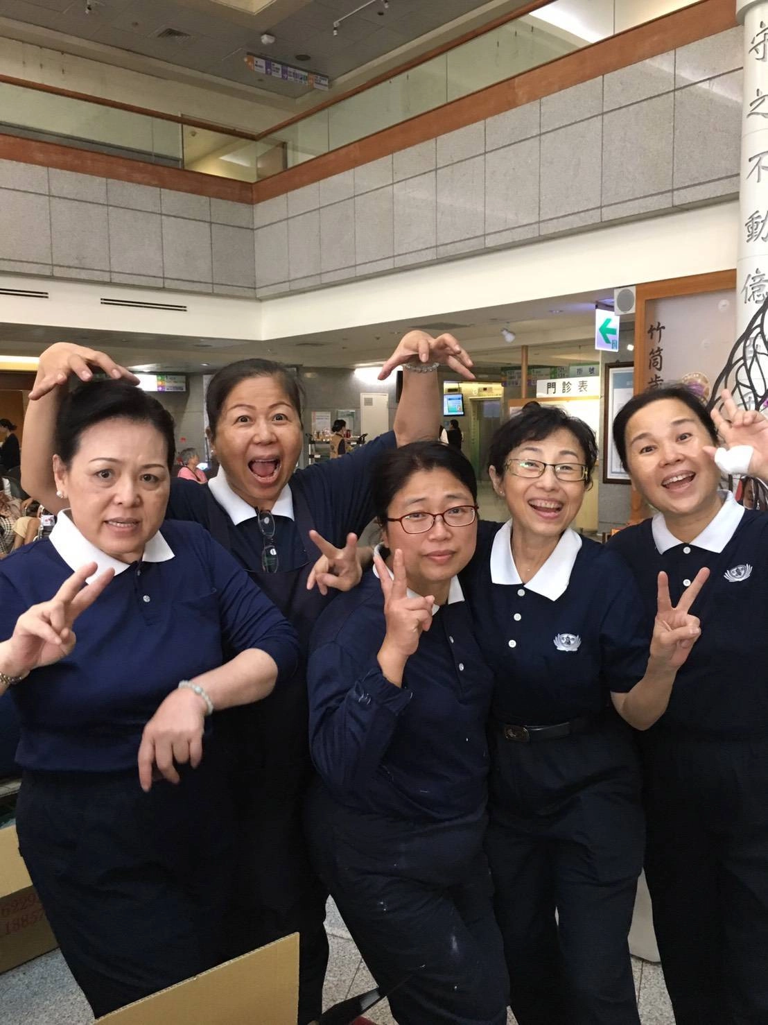 春足師姊(左二)在高雄親自整理各種義賣物品並寄送到大林慈院,每個月與伙伴們一起在大廳義賣。(圖片來源:林春足)