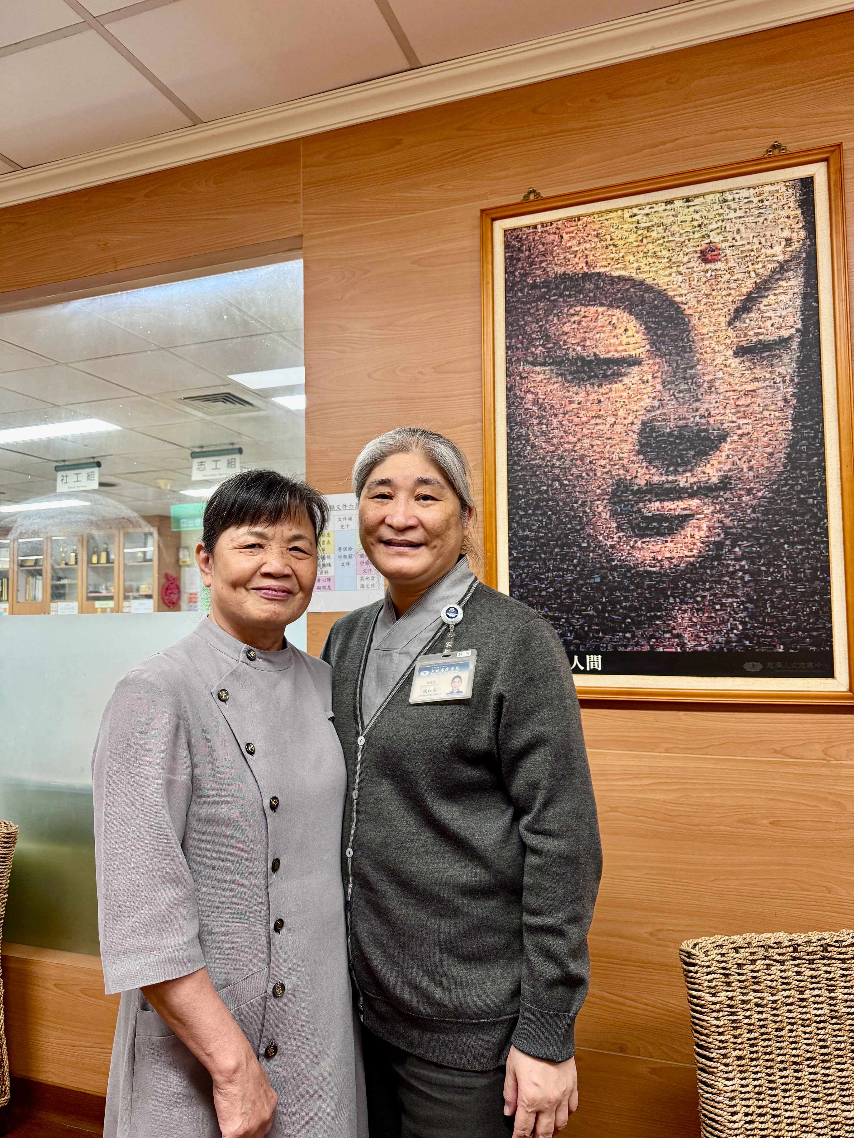 張紅芬(右)受證清修士法號是靜守,葉璧禎(左)說那她就是靜候,兩人一起靜靜地守候大林慈院。(攝影/許愷玹)