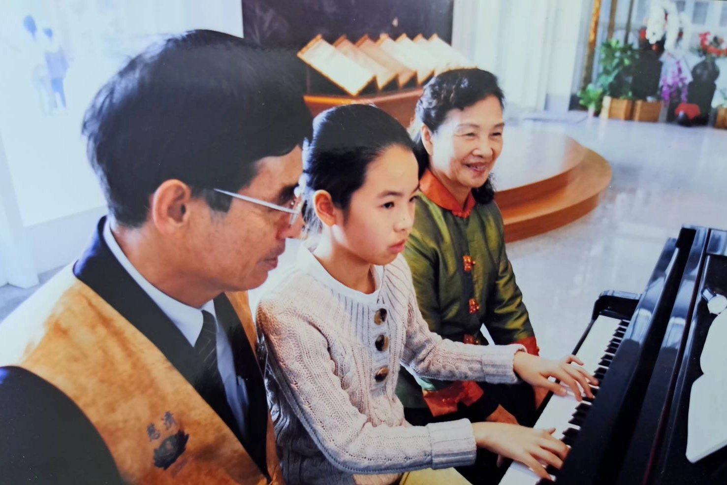 過年期間,徐林滿里(右)與徐水田(左)夫妻到大林慈濟醫院或臺中慈濟醫院當志工,孫女小蘋果(中)在醫院彈鋼琴,以溫柔樂聲撫慰病患與家屬。(圖片來源:徐林滿里提供)