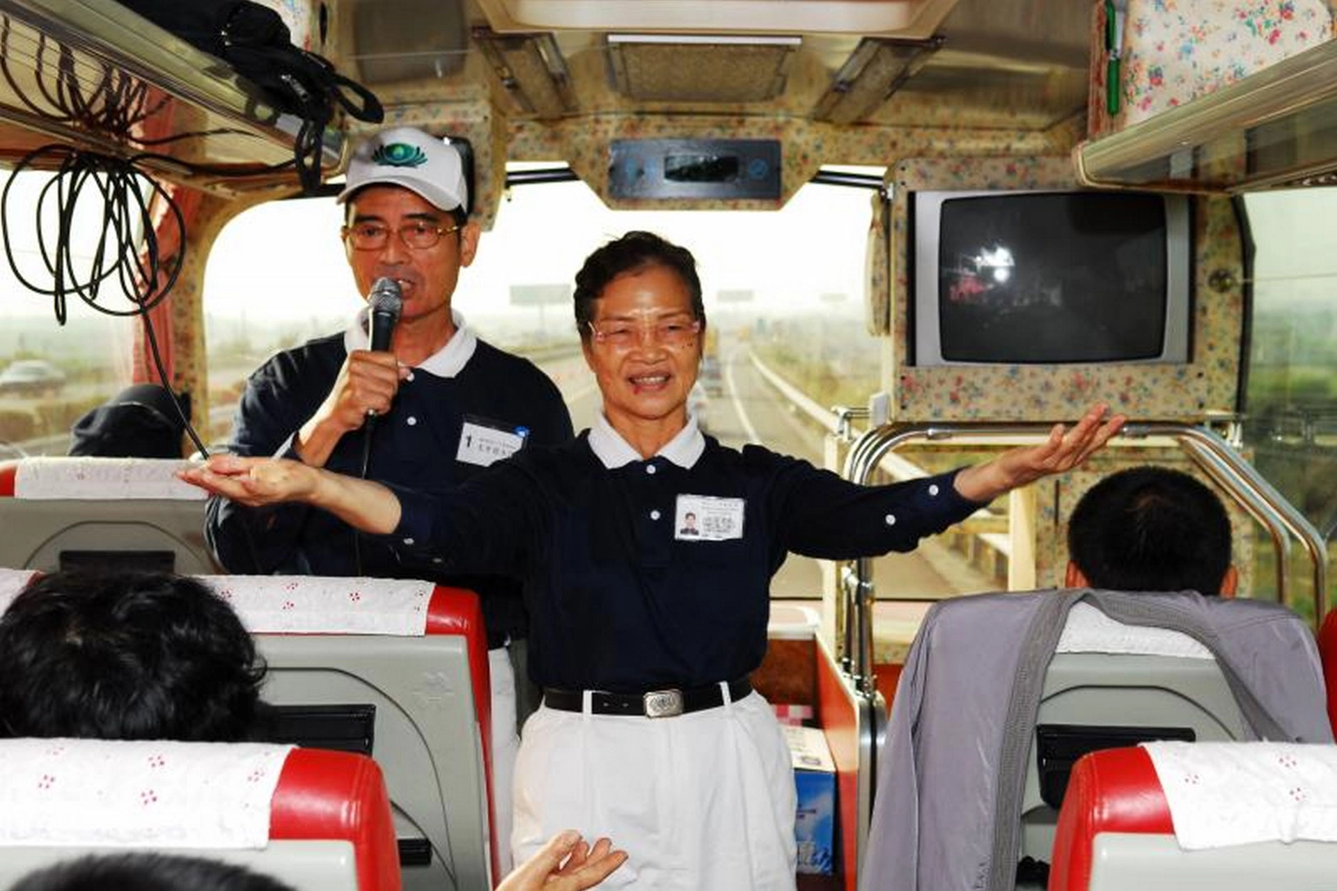 徐林滿里(右)與同修徐水田(左)是一對知名的菩薩道侶,時常在遊覽車上帶動手語與團康,傳遞歡樂。(攝影:鄧和男)