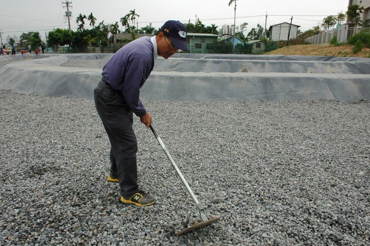 臺中慈濟志業園區醫療園區工程人工溼地鋪設碎石,徐水田賣力協助剷平整地。(2006/12/14;攝影:曾東勝)