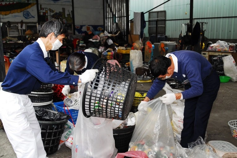 在臺中十甲環保站,徐水田(右)與慈濟志工們合力分類資源回收物。(2008/01/08;攝影:鄧和男)