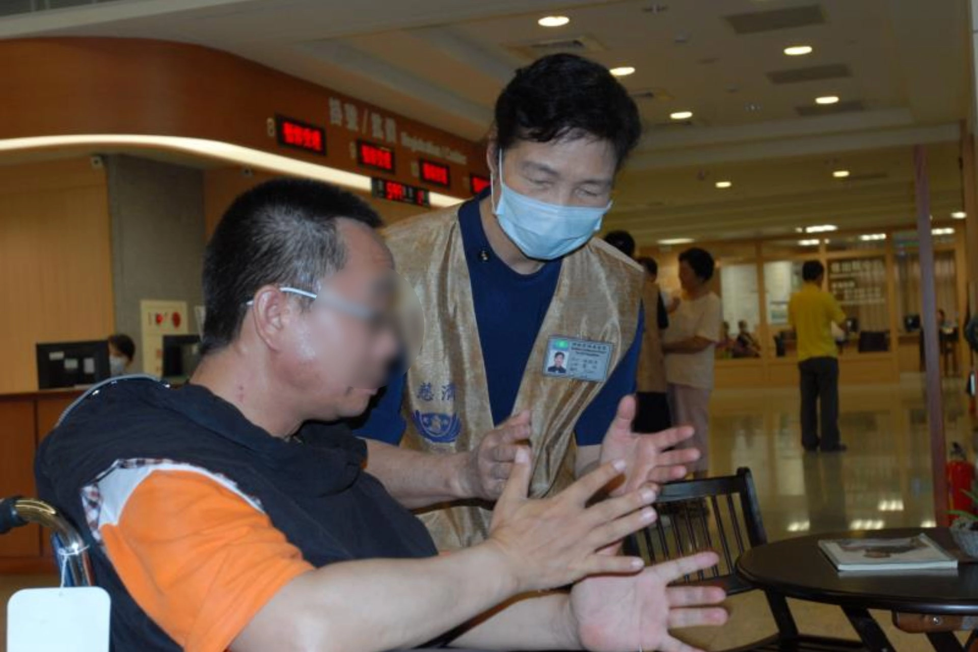 一路上,徐水田總是默默陪伴並協助徐林滿里。在醫院裡,他負責帶領團康活動;志工早會時,也常上臺帶動手語表演,為志工們注入滿滿的活力與精神。