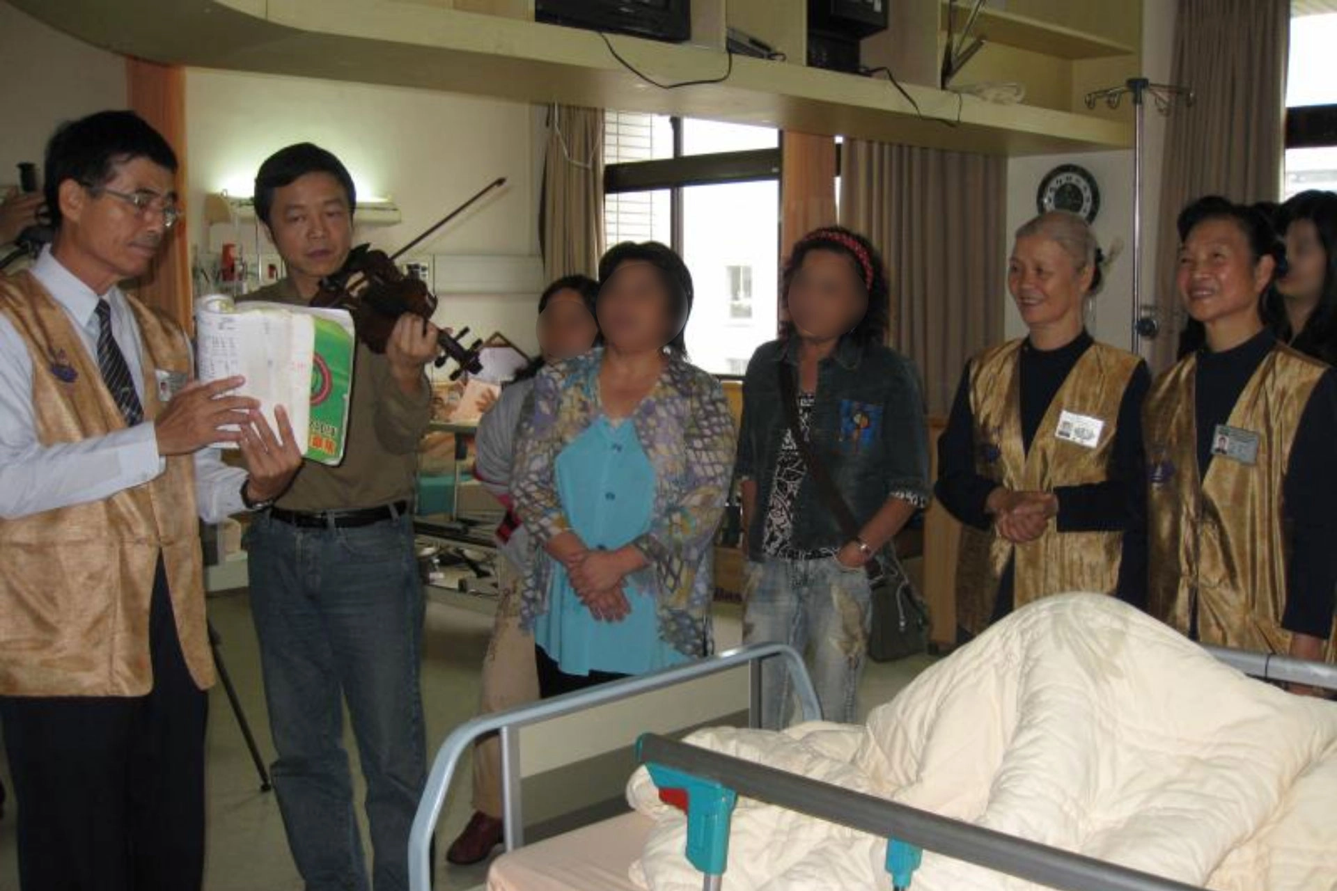 花蓮醫院醫療志工為病患帶來音樂表演。徐水田(左一)、徐林滿里(右一)與兒子林錫隆(左二)以樂會友,撫慰病苦。(攝影:周中慧)